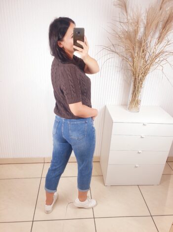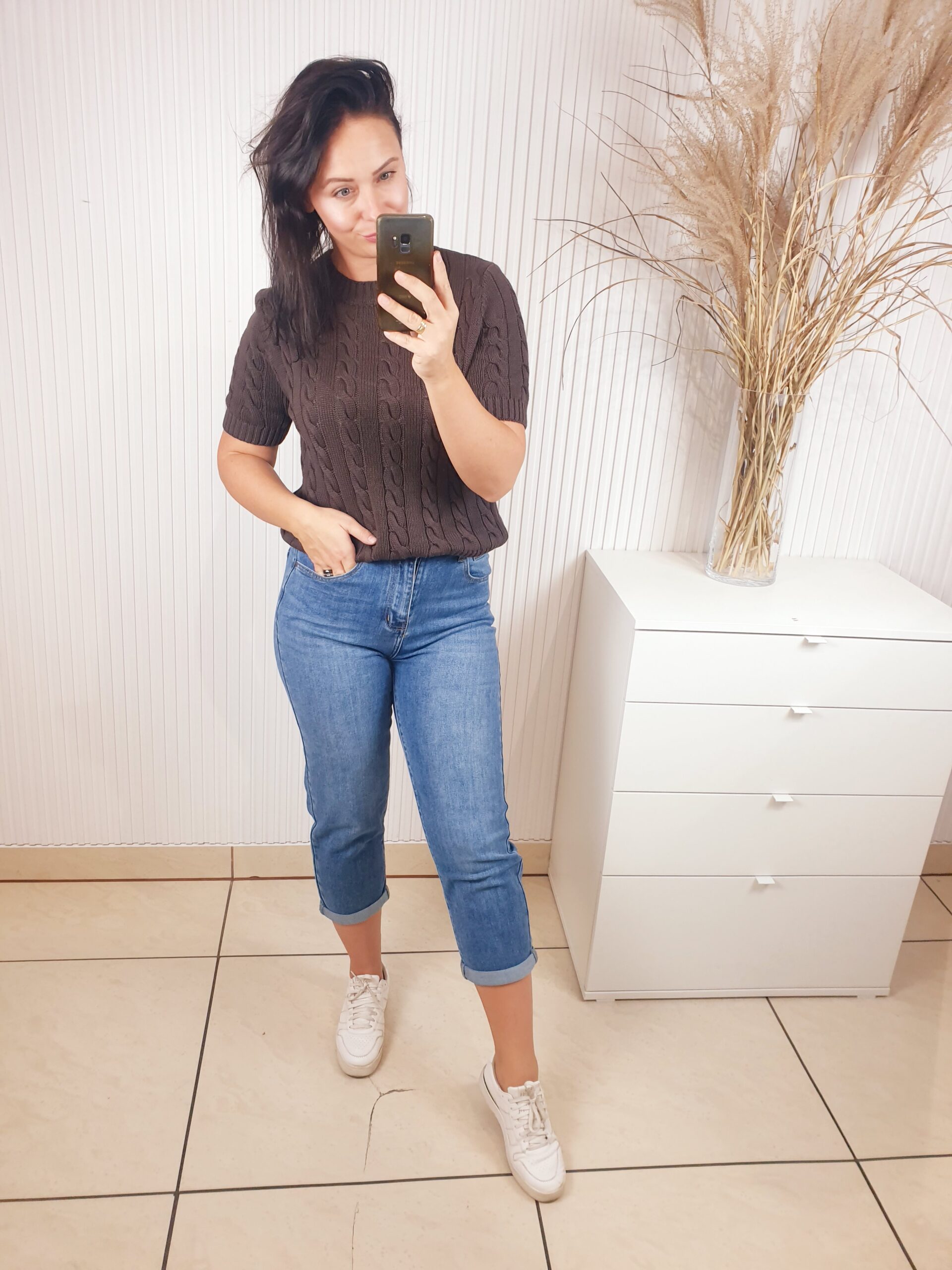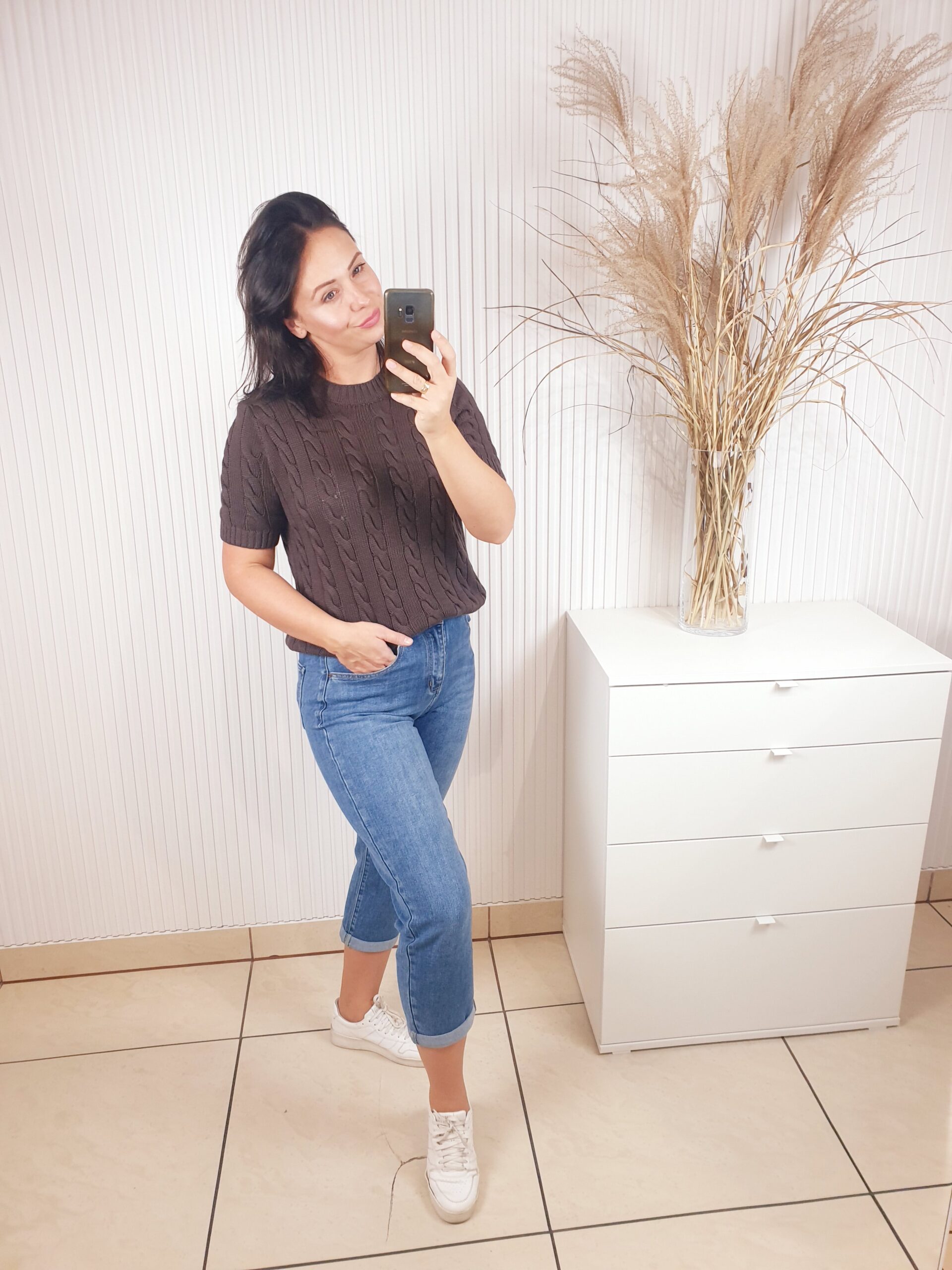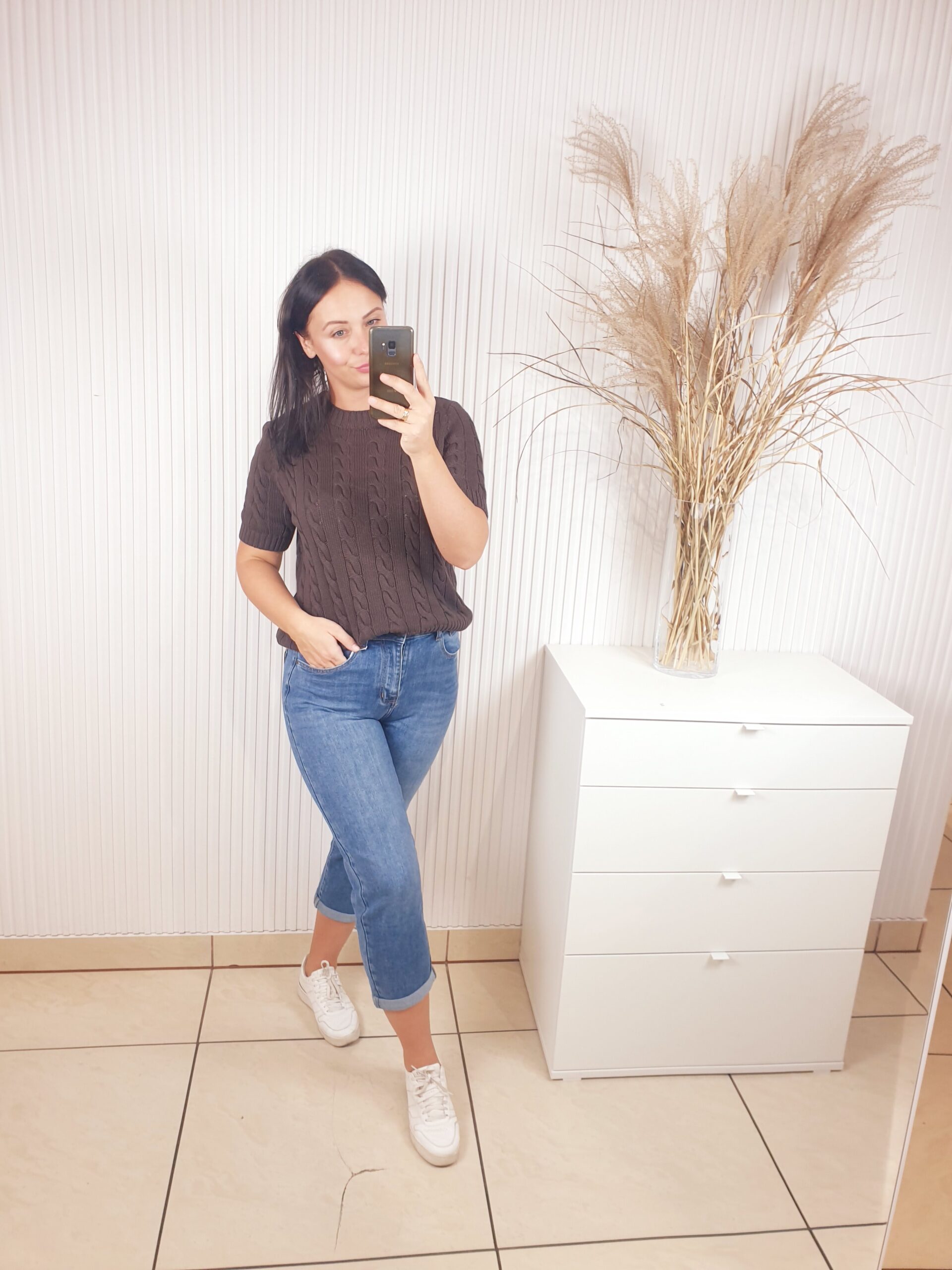 sweter, krótki, krótki rękaw, ze ściągaczem, w warkoczowy splot, luźny, rozmiar uniwersalny, kolor czekoladowy brąz