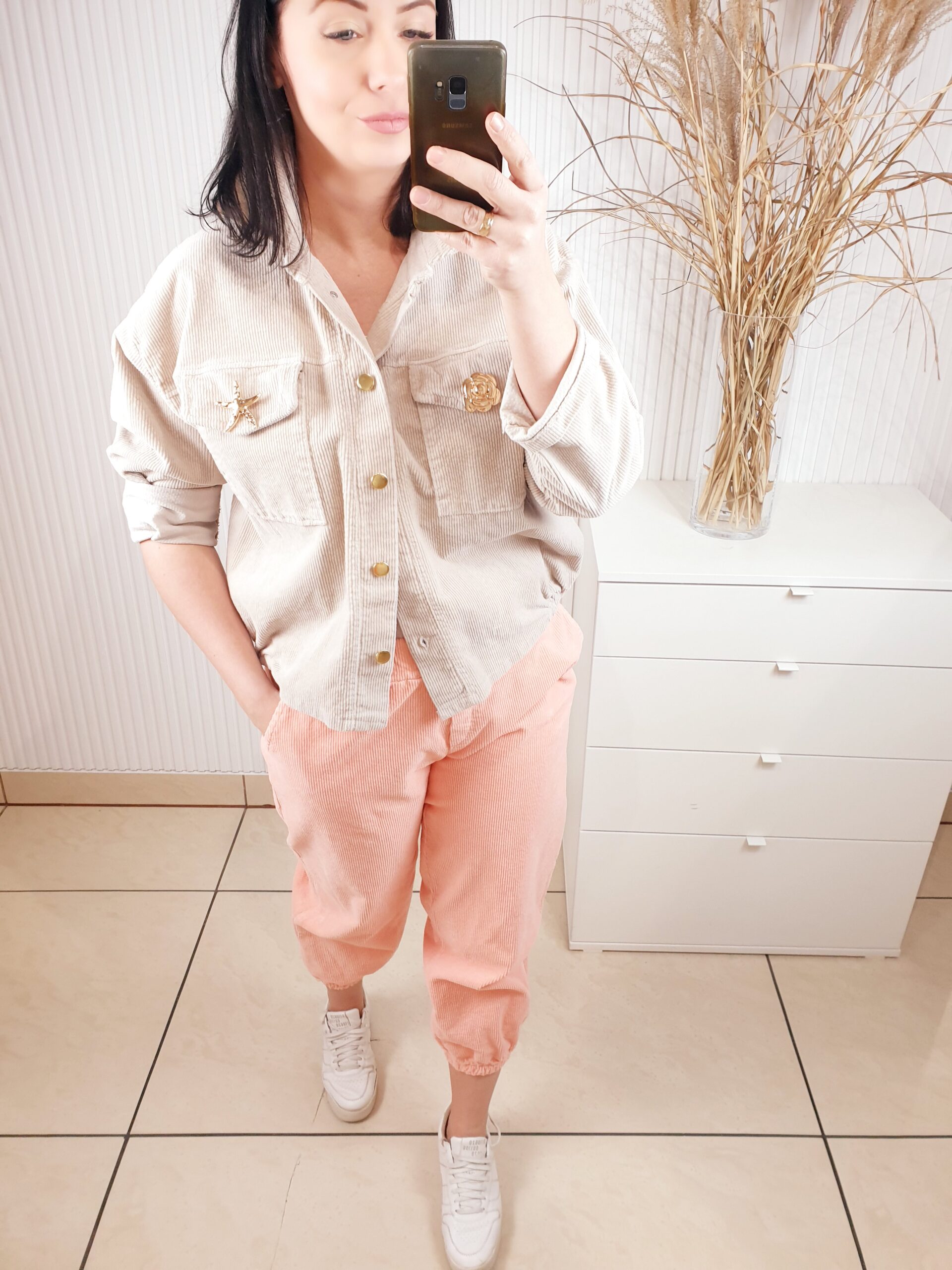 spodnie, livansy, sztruksowe, morelowe, ze złotym guzikiem, z kieszeniami