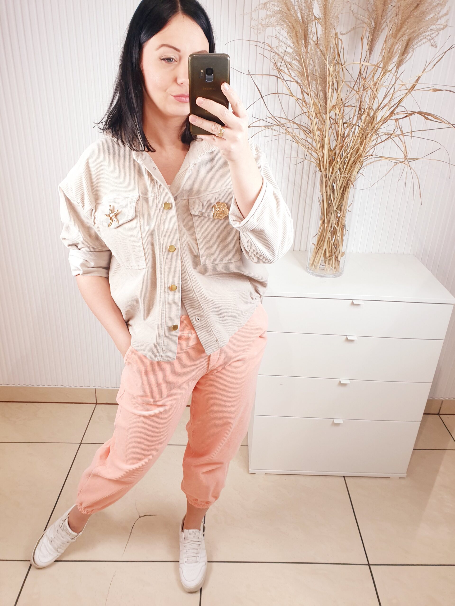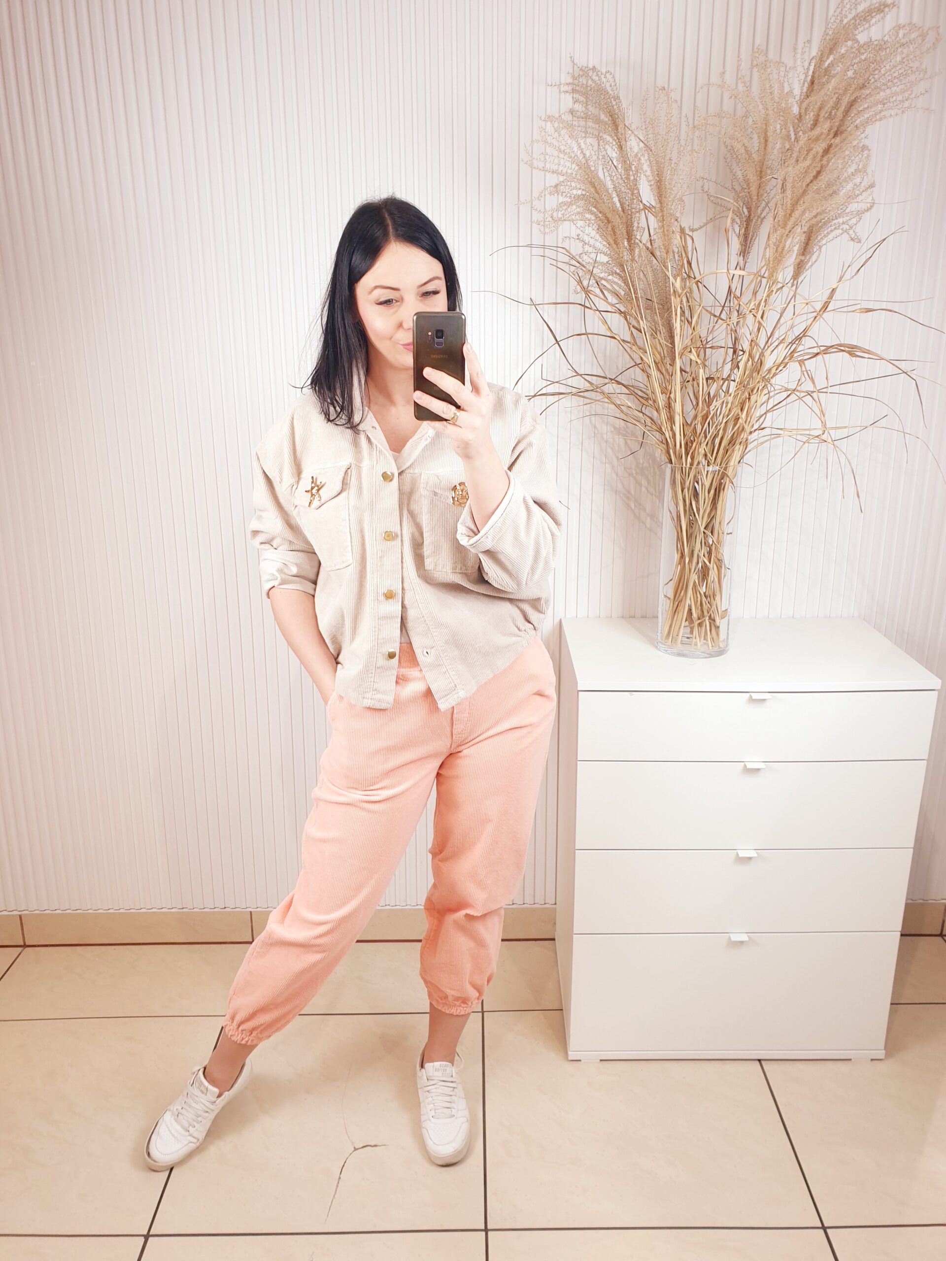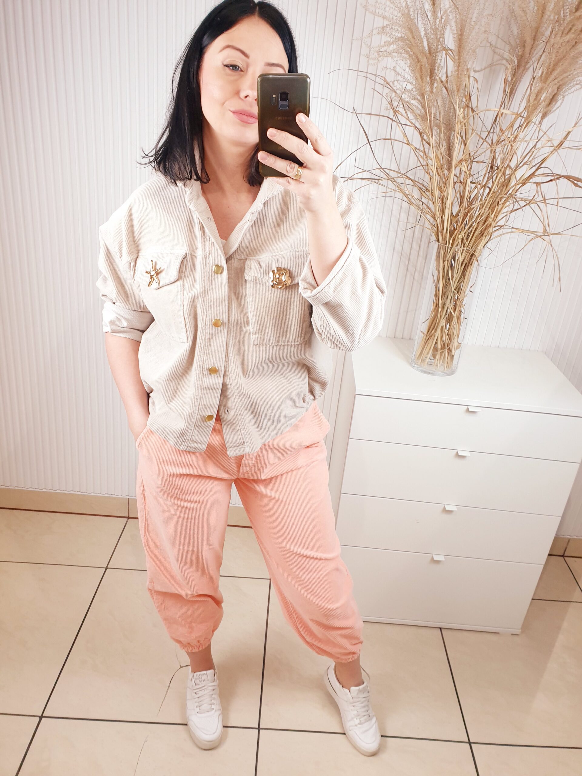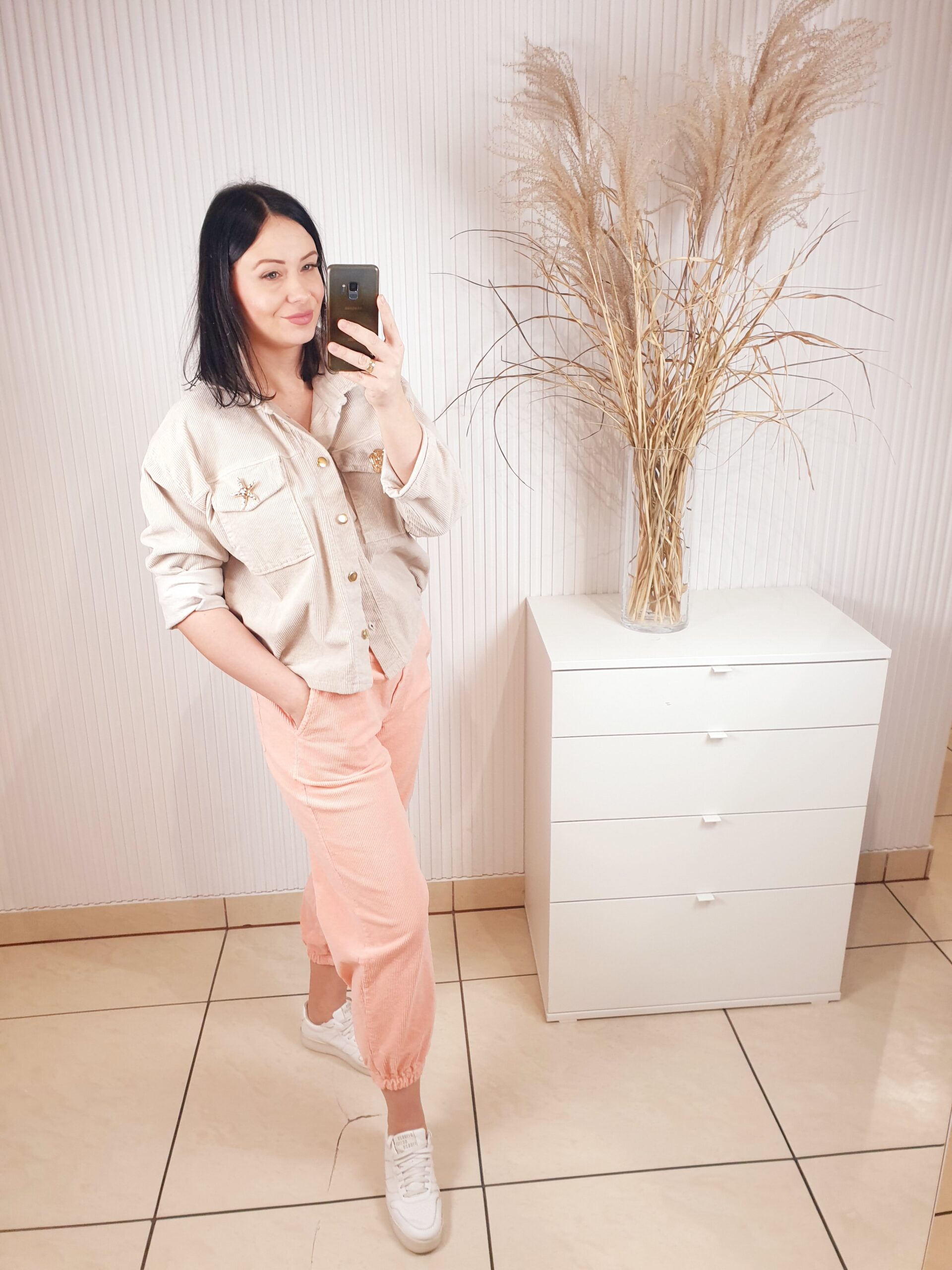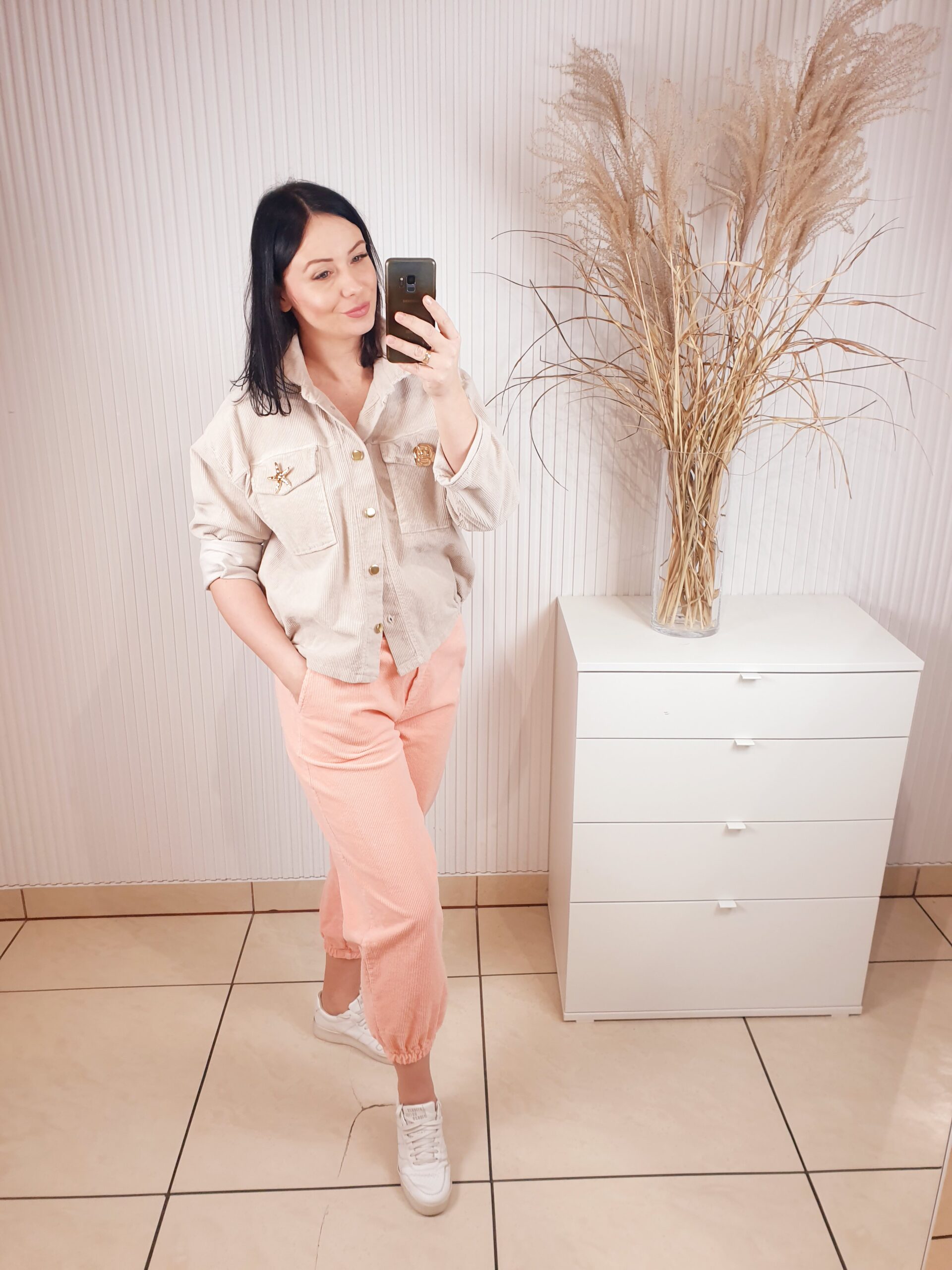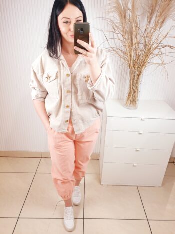 Spodnie o luźniejszym fasonie, posiadają gumkę w pasie oraz dwie kieszenie po bokach oraz z tyłu. W przepięknym morelowym odcieniu . Wykonane z cienkiego materiału typu sztruks, ze złotym, biżuteryjnym guzikiem. Idealne do sportowych, wiosennych stylizacji.