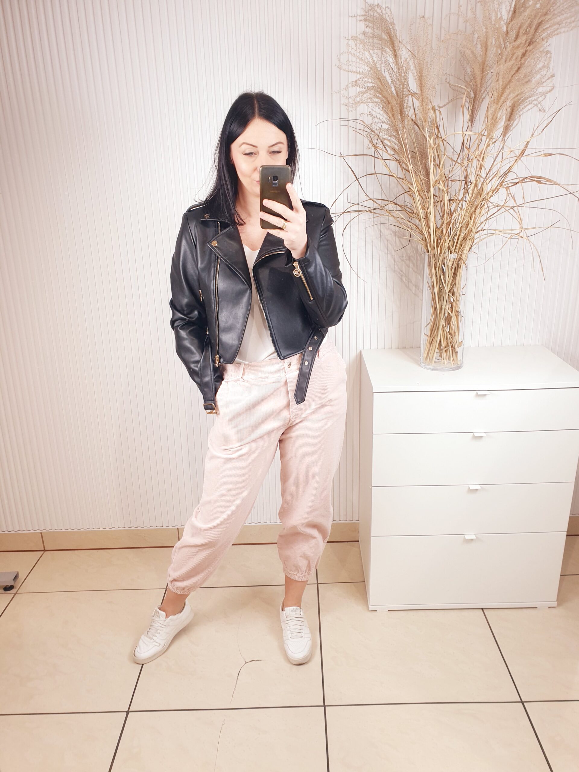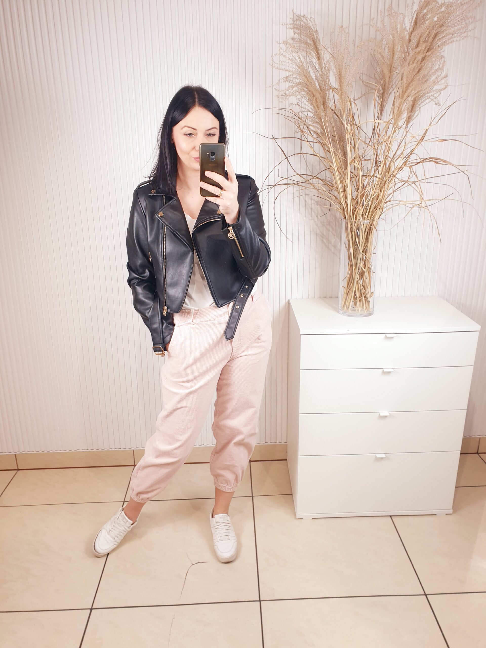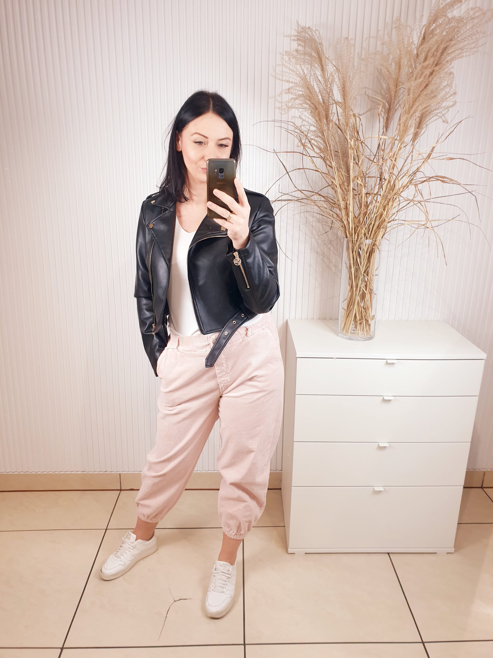 Spodnie o luźniejszym fasonie, posiadają gumkę w pasie oraz dwie kieszenie po bokach oraz z tyłu. W przepięknym odcieniu pudrowego różu. Wykonane z cienkiego materiału typu sztruks, ze złotym, biżuteryjnym guzikiem. Idealne do sportowych, wiosennych stylizacji.