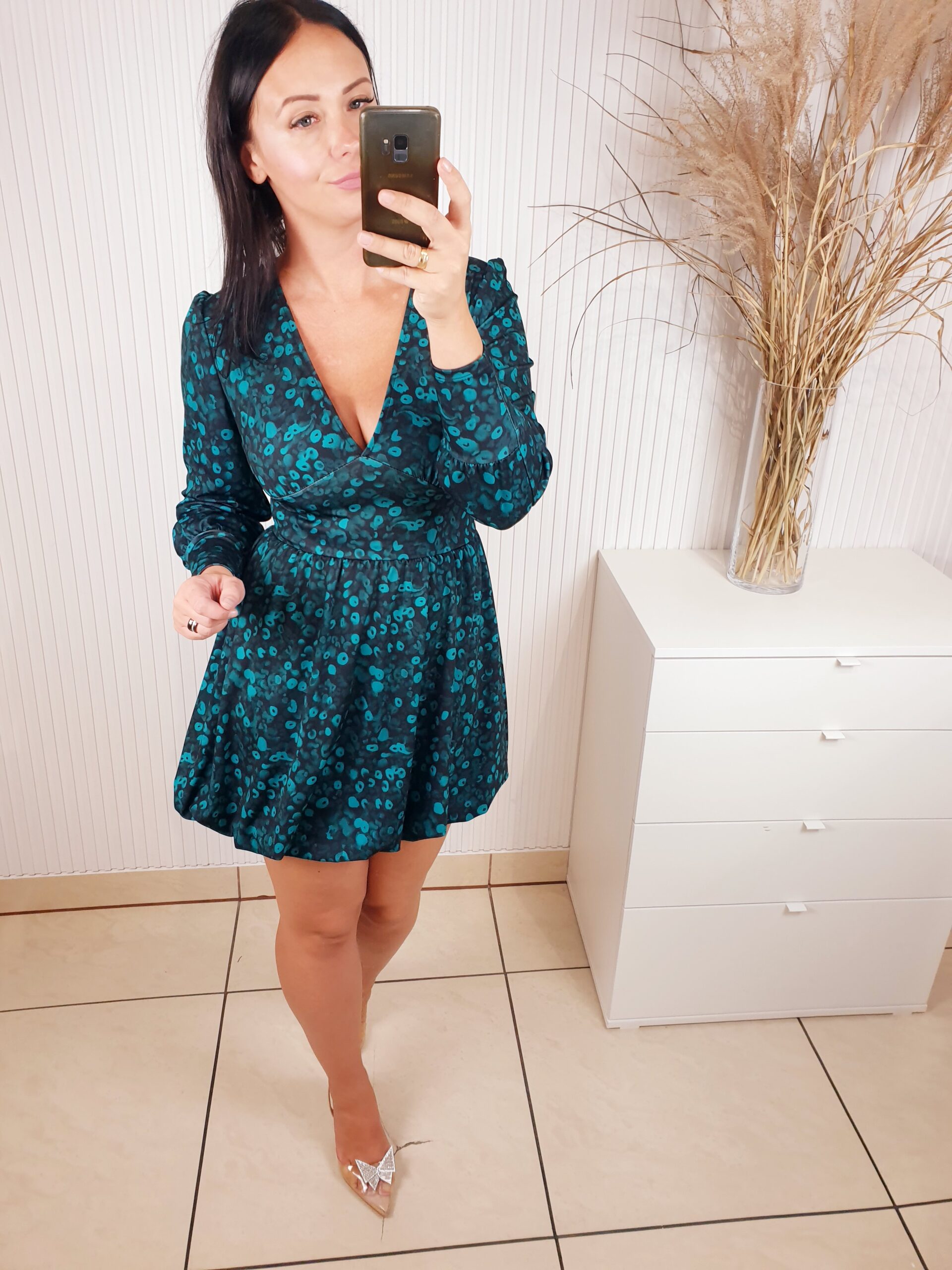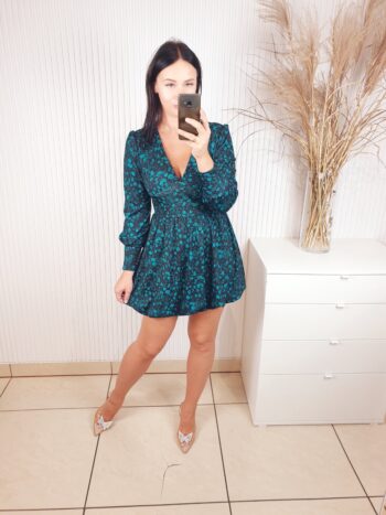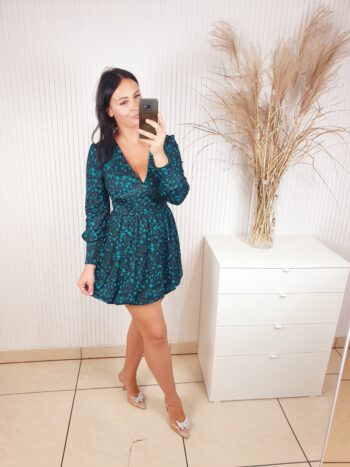 sukienka, mini, zielona, z długim rękawem, dekolt w serek, bombka