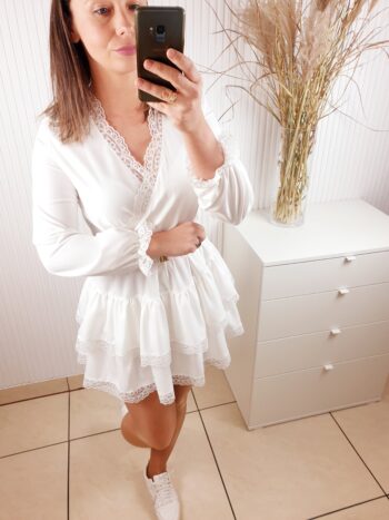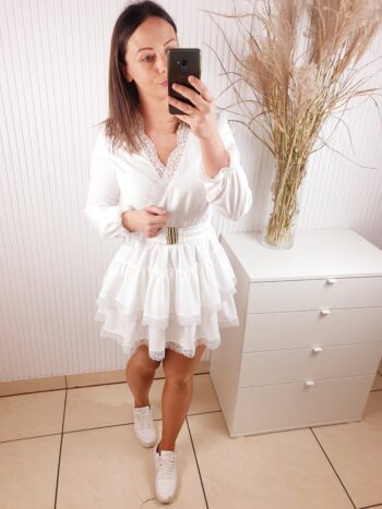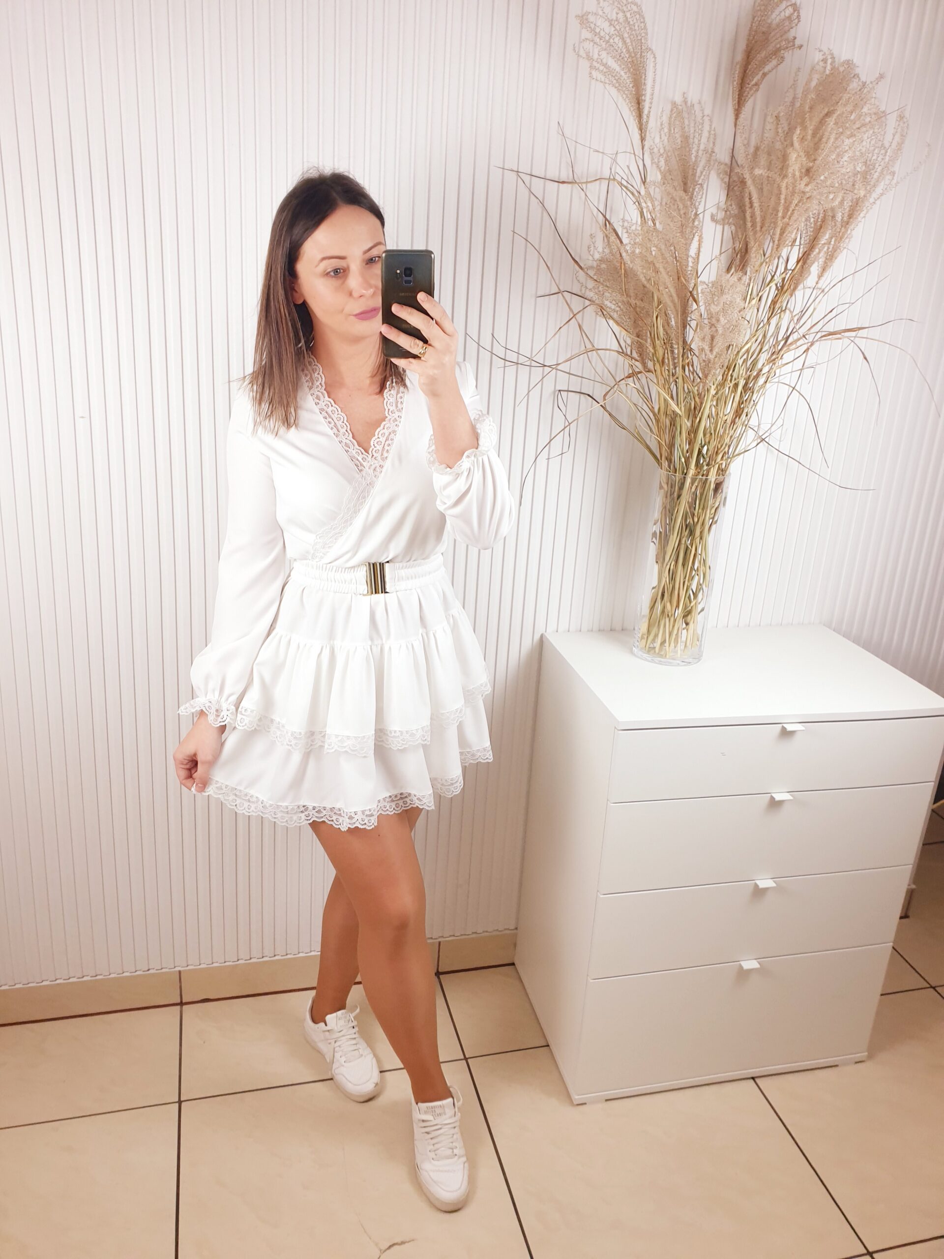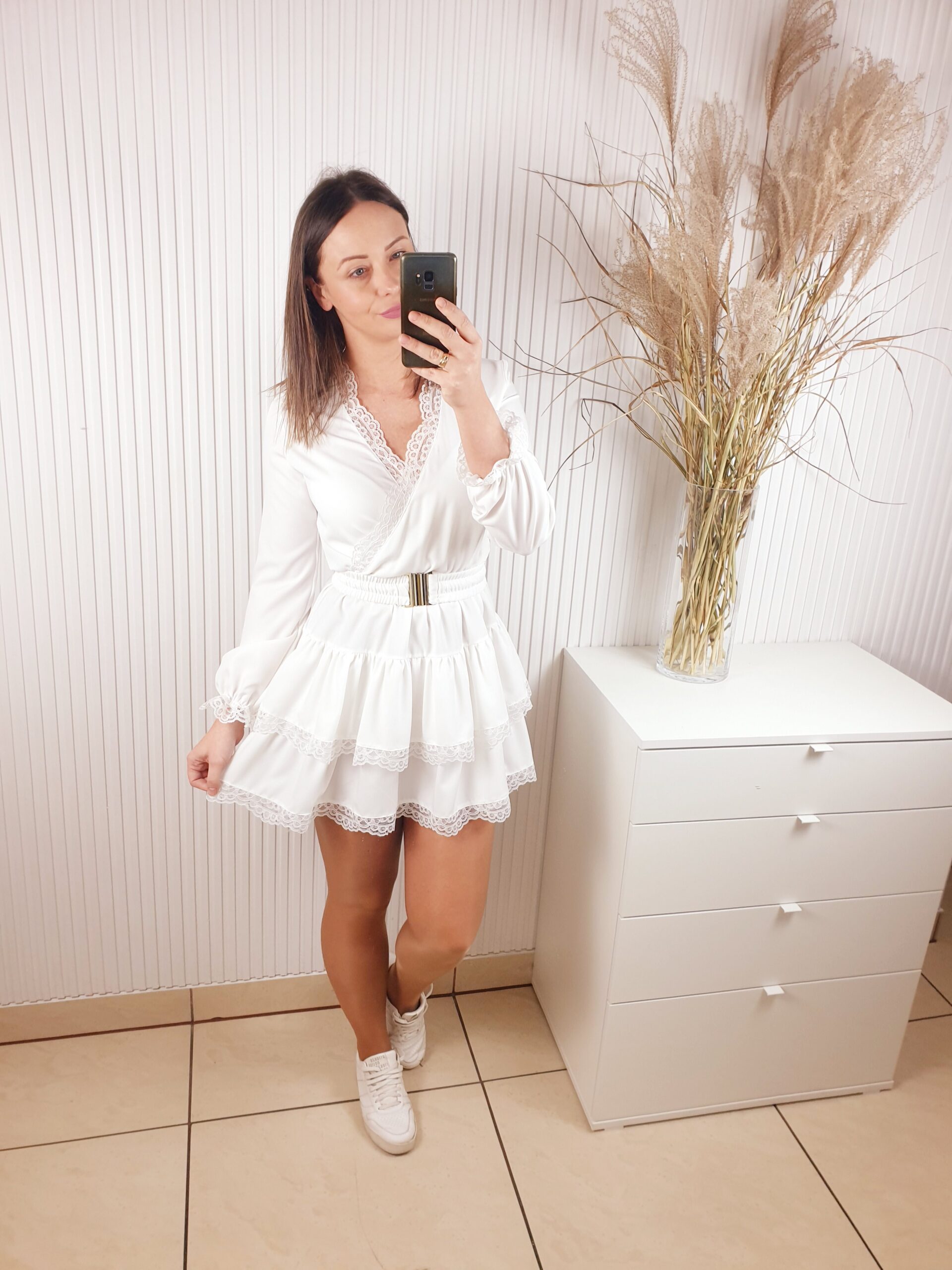 Biała sukienka z długim rękawem, kopertowym dekoltem, falbankami i paskiem ze złotą klamrą. Wykończona koronką. Długość mini. Bardzo elegancka, idealna na wyjątkowe okazje.