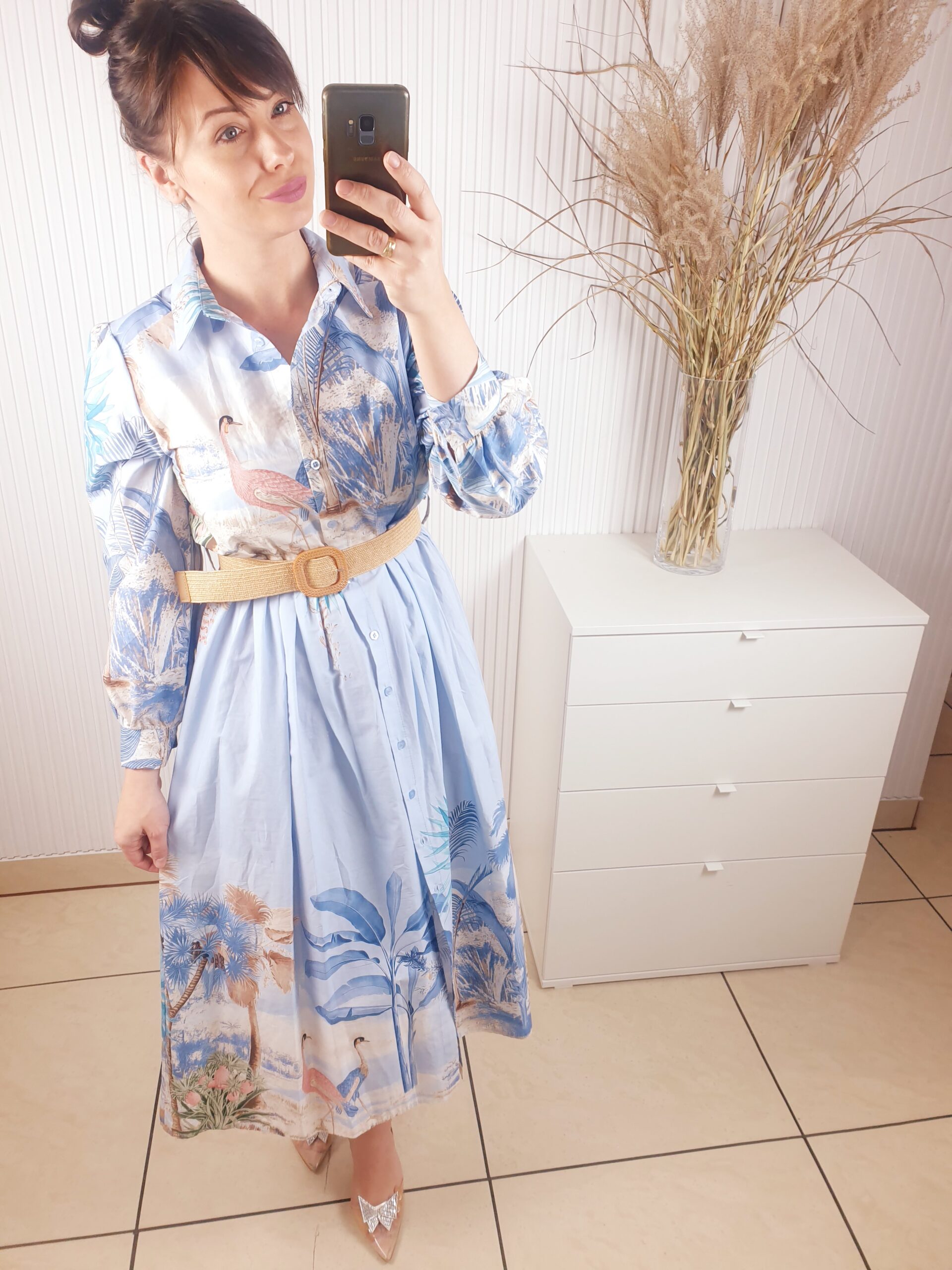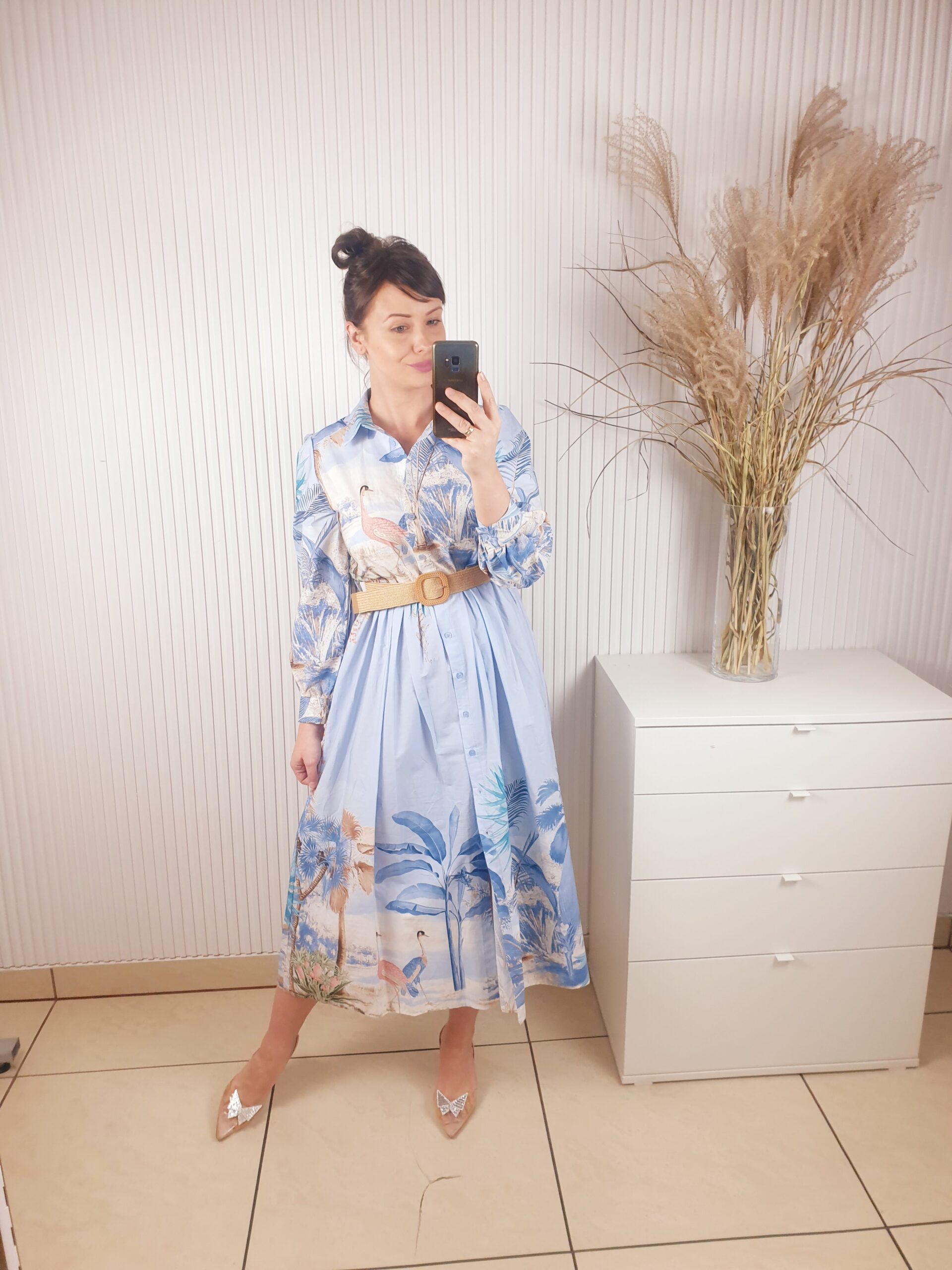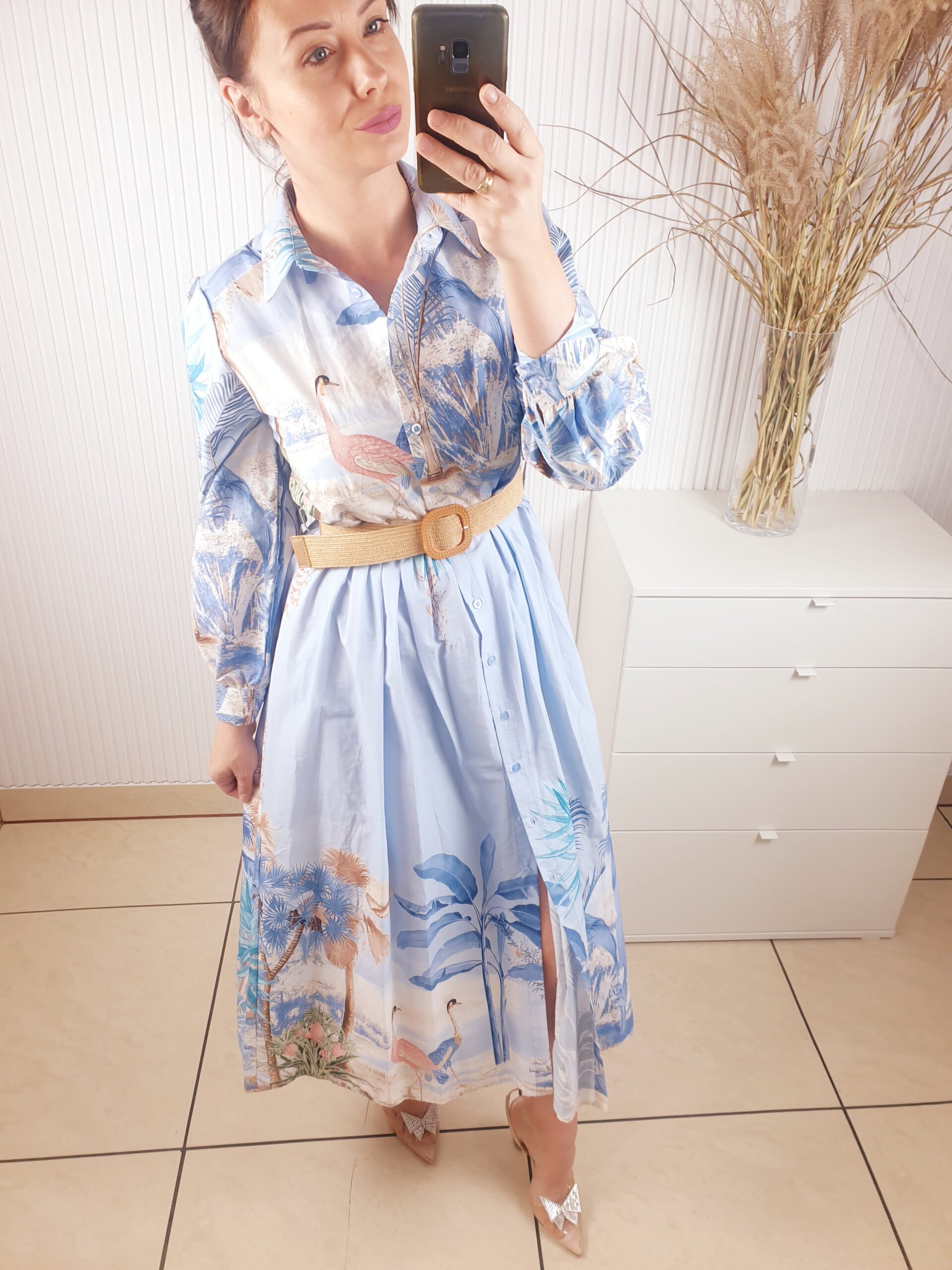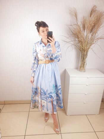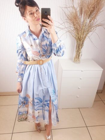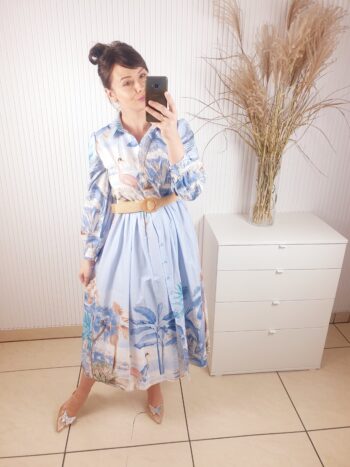 Sukienka z kołnierzykiem, długim rękawem, zapinana na guziki. Posiada beżowy pasek w zestawie. Długość maxi. Wykonana z lekkiego, przewiewnego materiału w oryginalny wzór w ptaki oraz liście. Rozmiar uniwersalny.