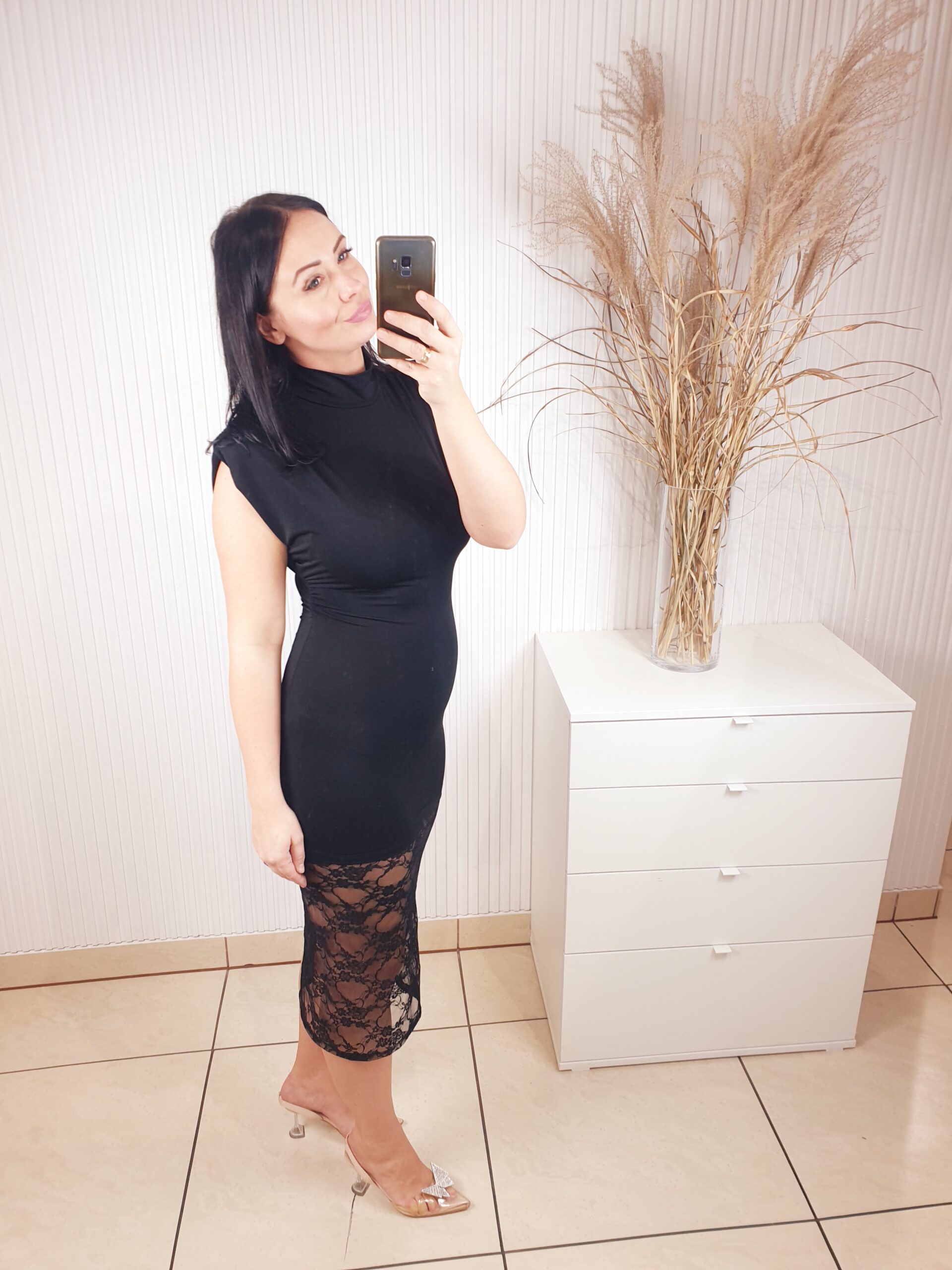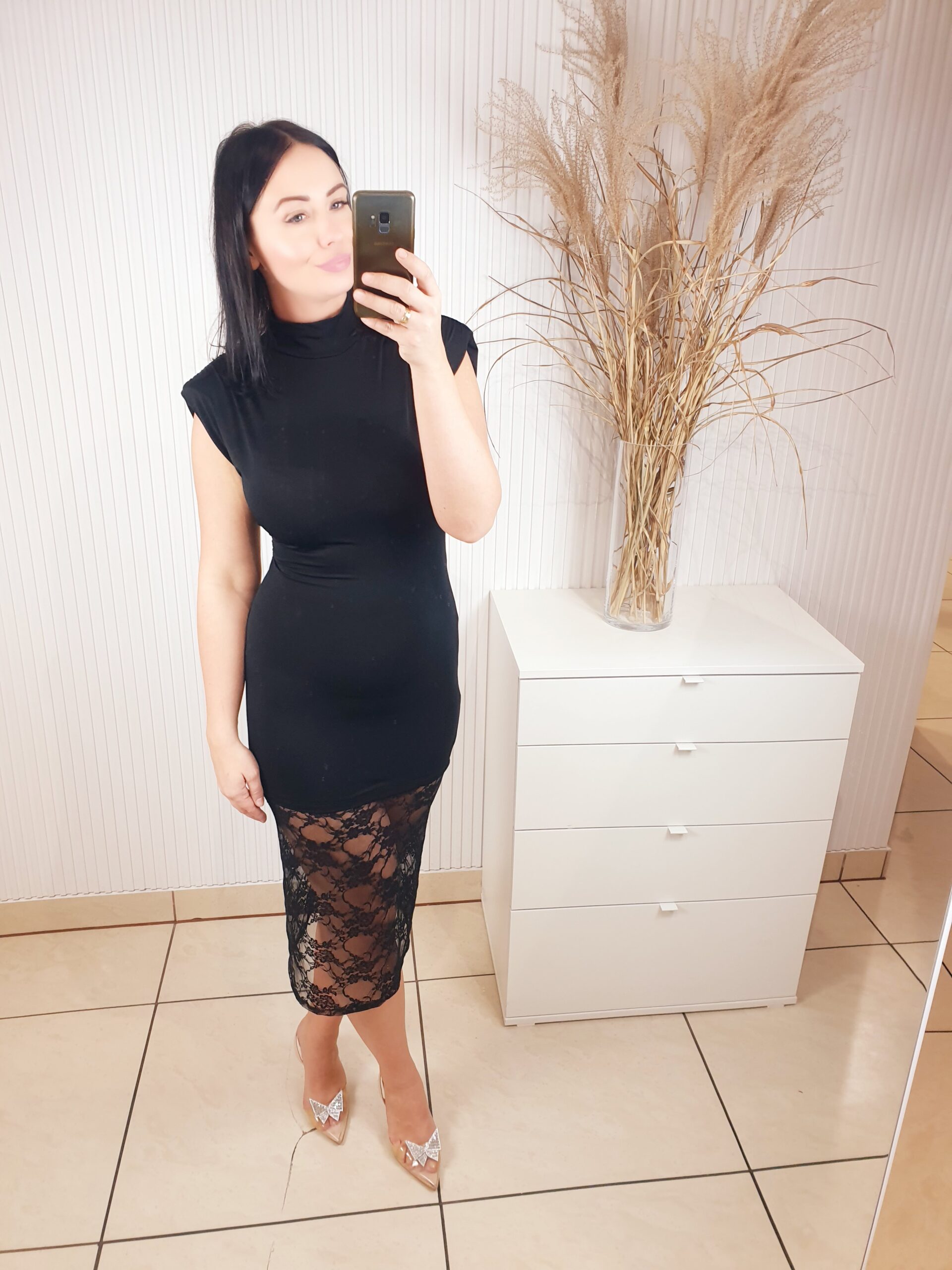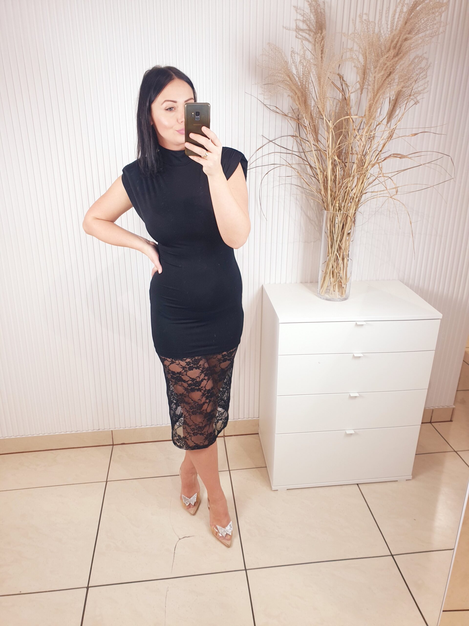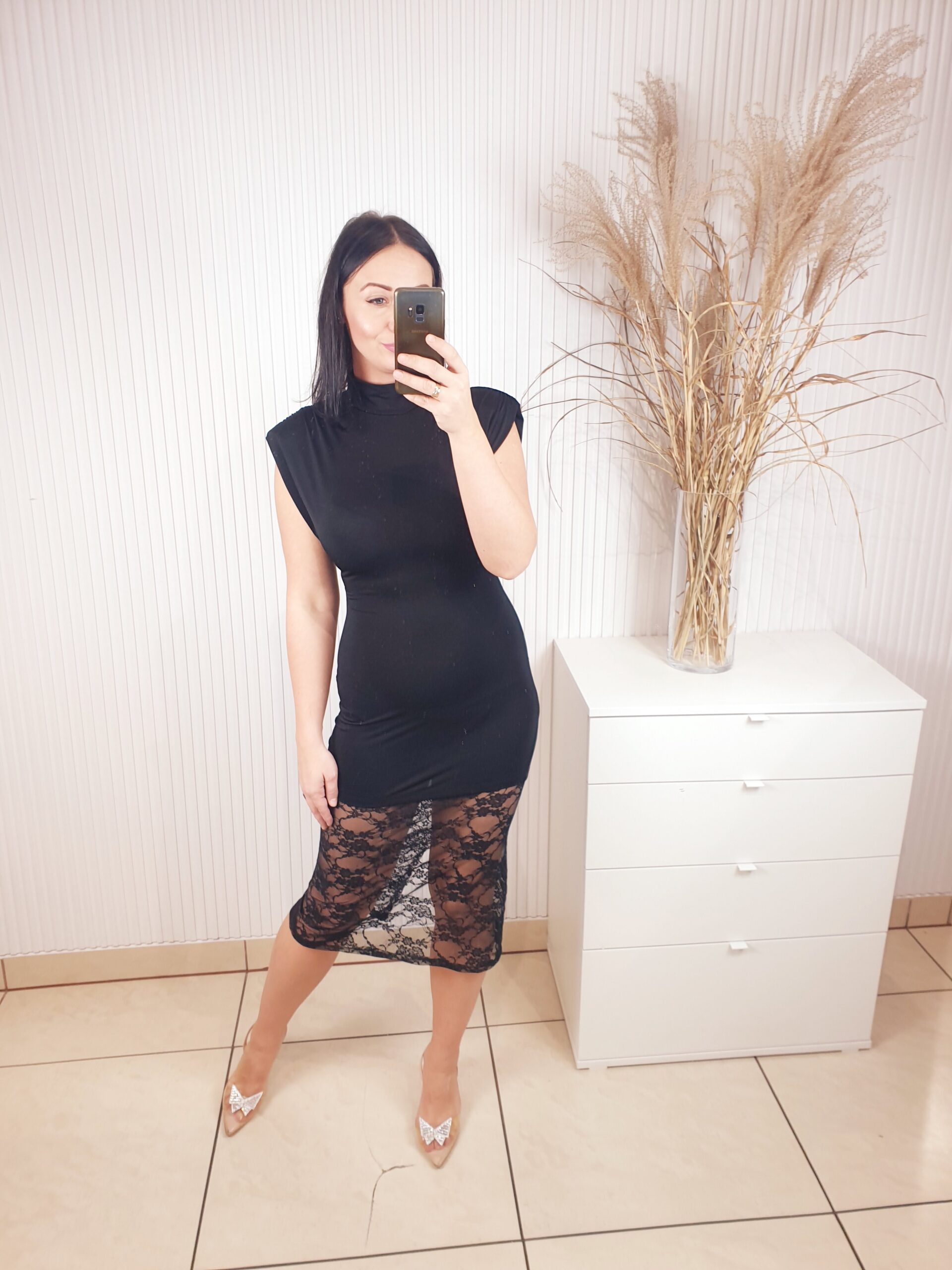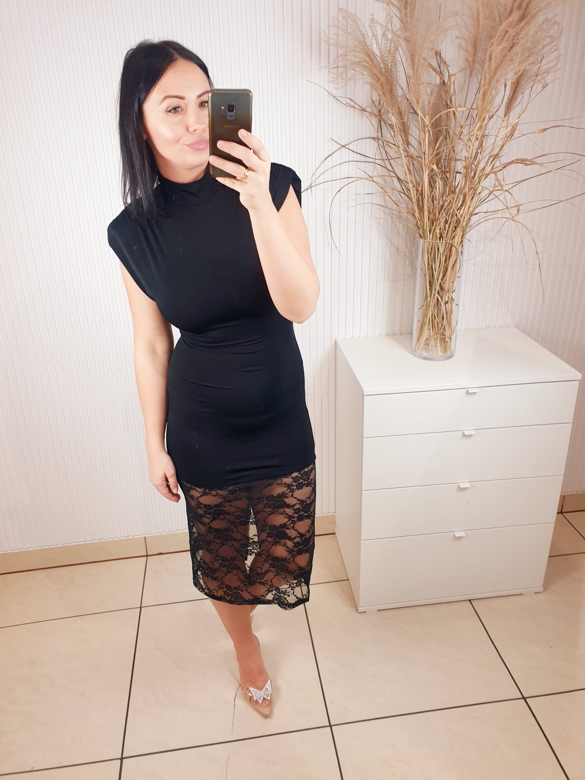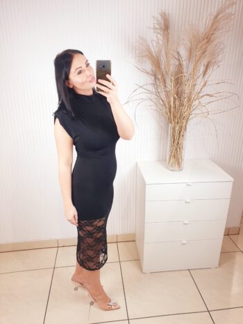 Sukienka z krótkim rękawem, wykonana z elastycznego, dopasowującego się materiału . Bardzo elegancka i szykowna, a jednocześnie prosta. Posiada efektowny dół wykonany z koronkowego materiału. Idealnie sprawdzi się na wiele różnych okazji.