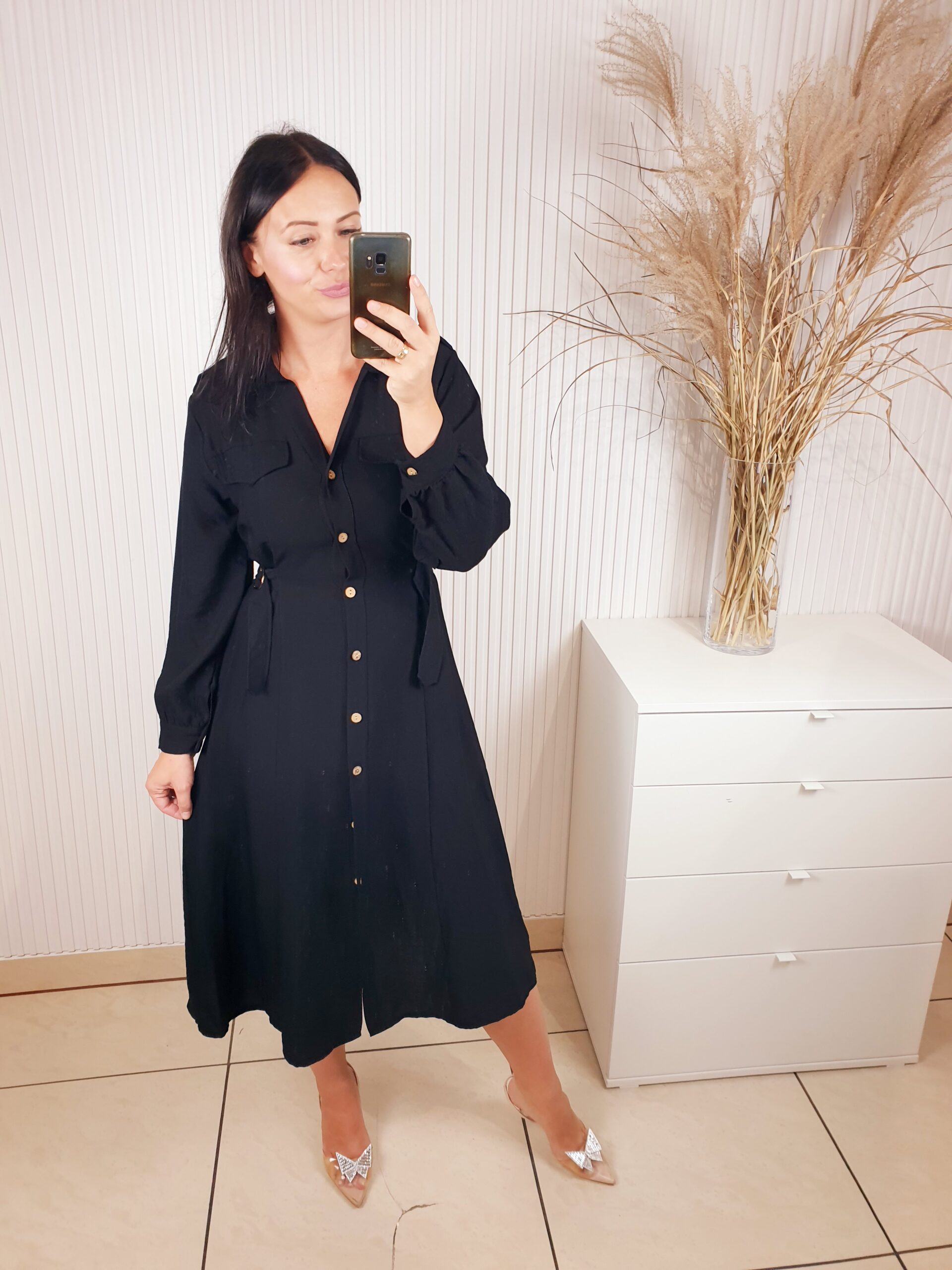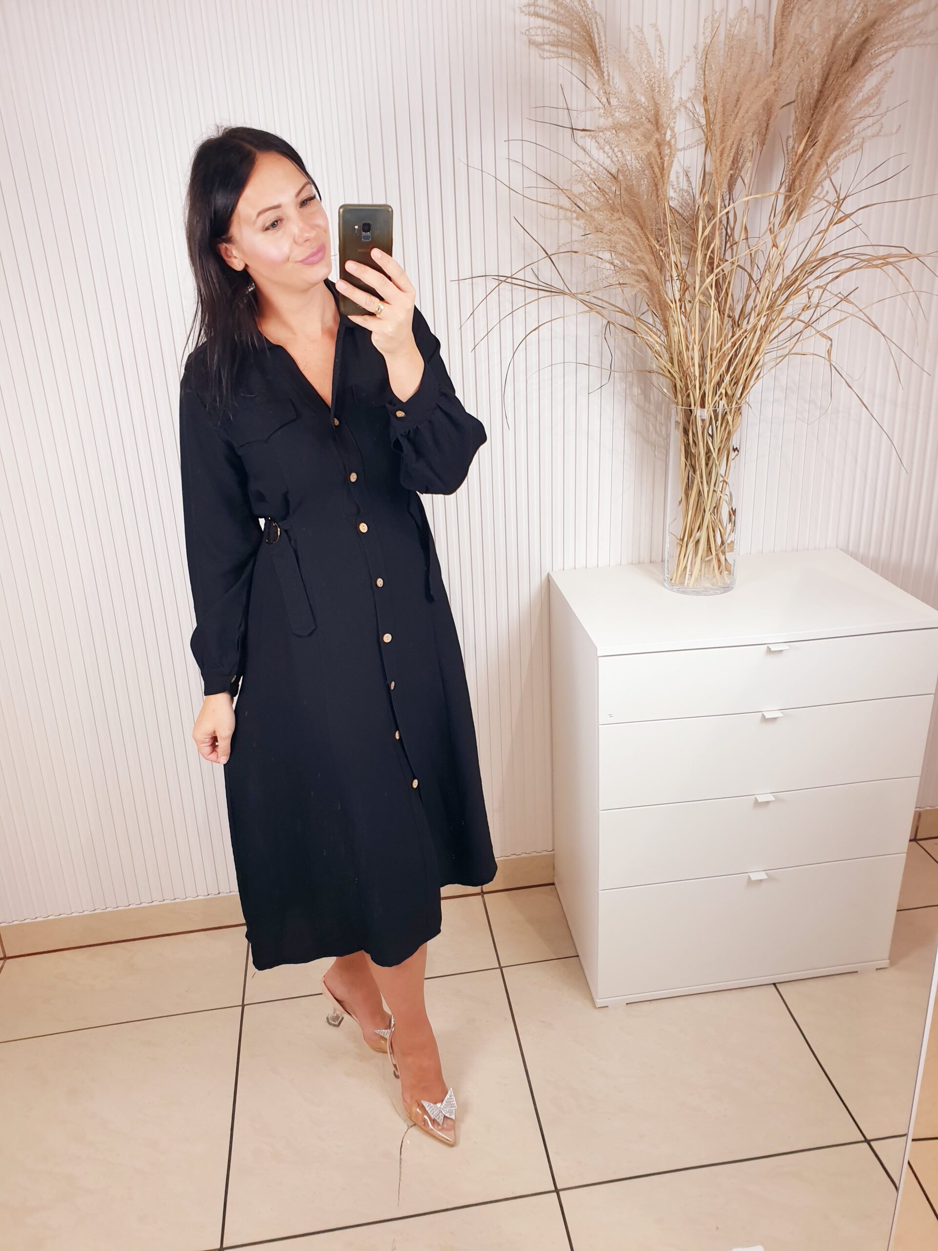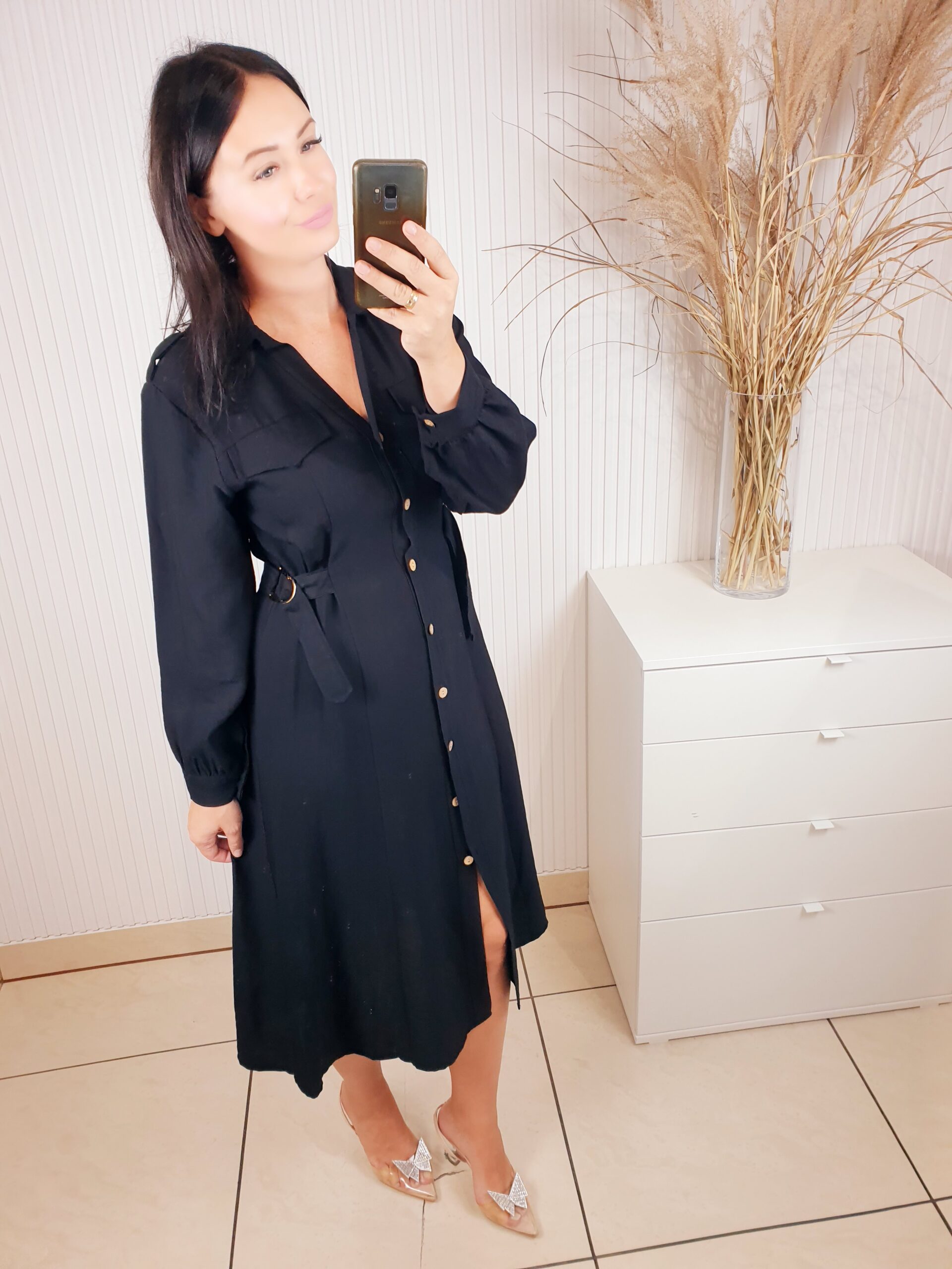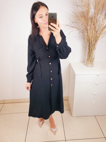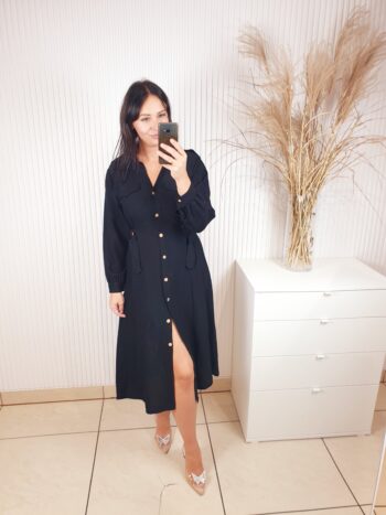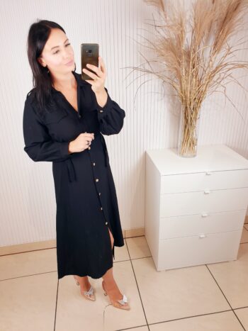 Sukienka w stylu szmizjerki o długości midi. Zapinana na beżowe guziki, posiada długi rękaw. W talii regulacja za pomocą ozdobnych złotych klamerek. Idealna do jesiennych stylizacji.
