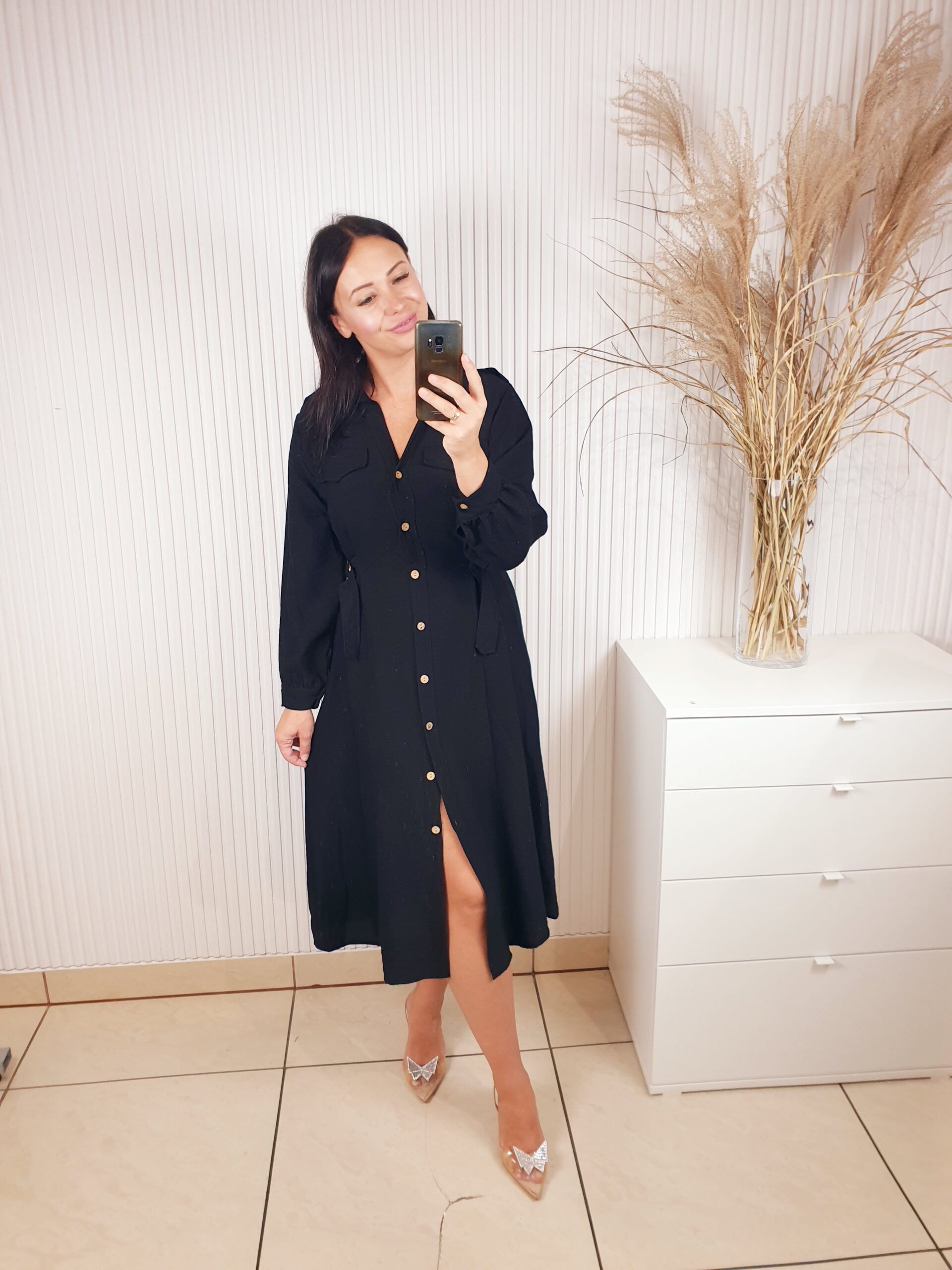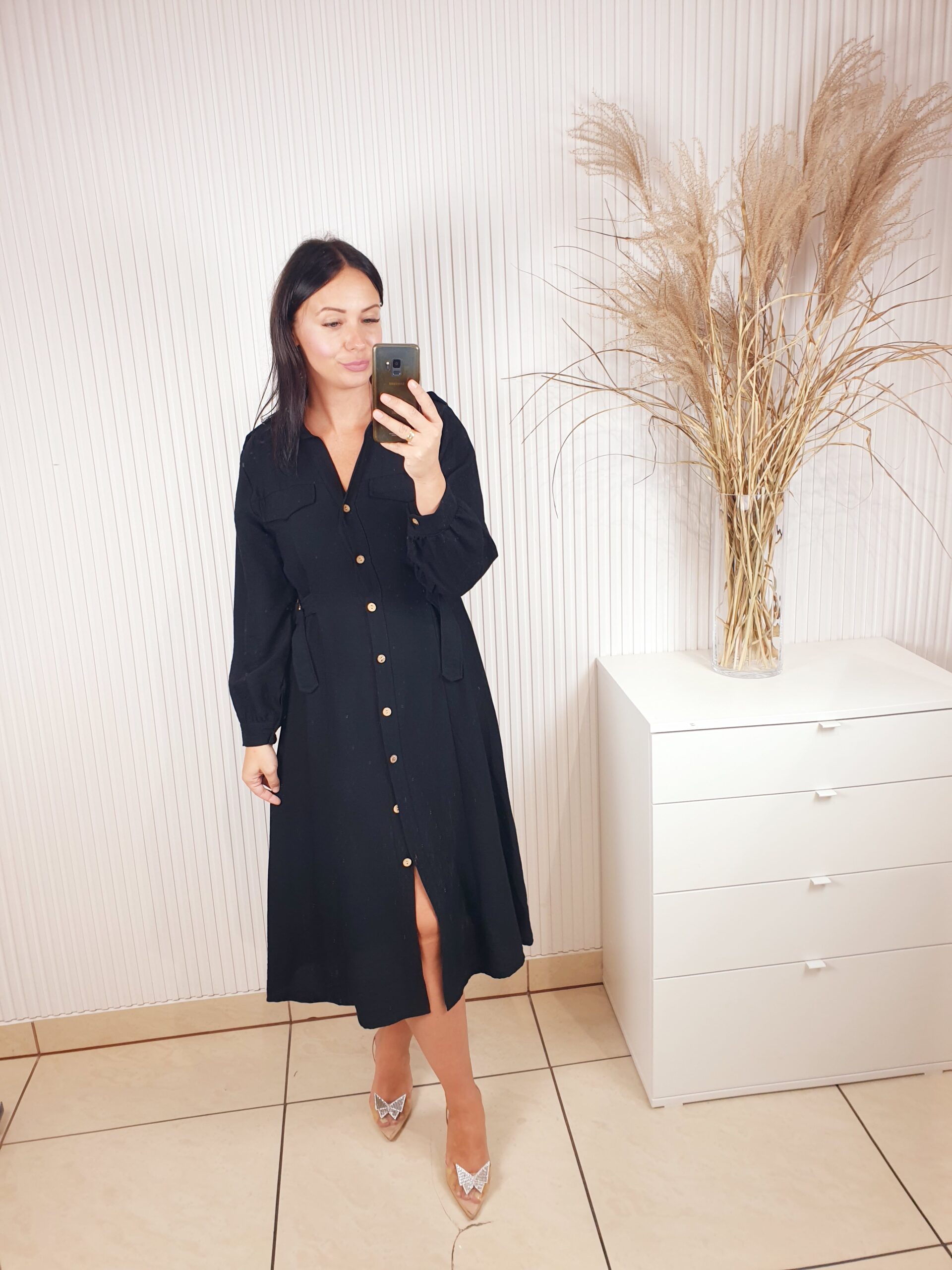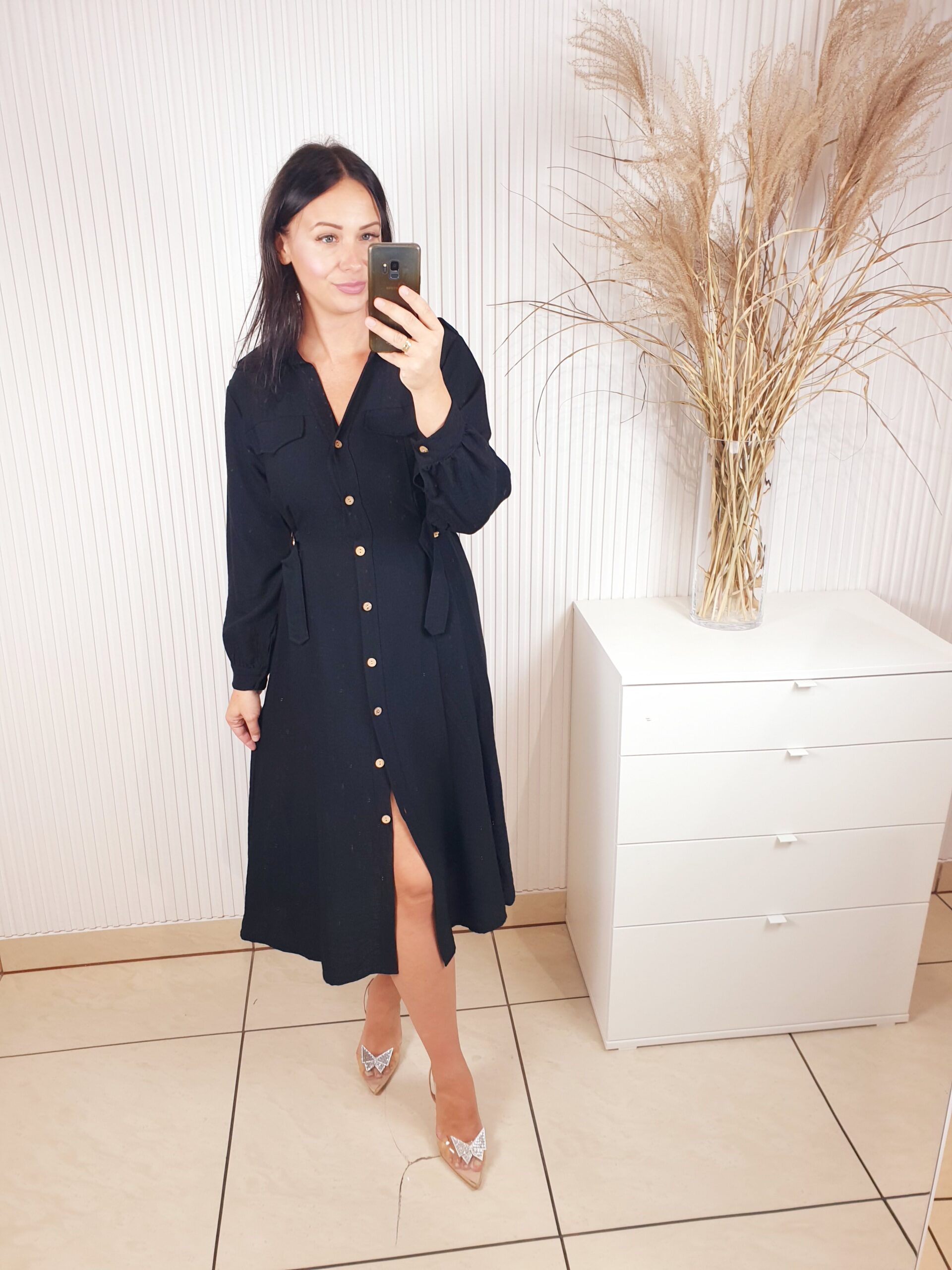 Sukienka w stylu szmizjerki o długości midi. Zapinana na beżowe guziki, posiada długi rękaw. W talii regulacja za pomocą ozdobnych złotych klamerek. Idealna do jesiennych stylizacji.