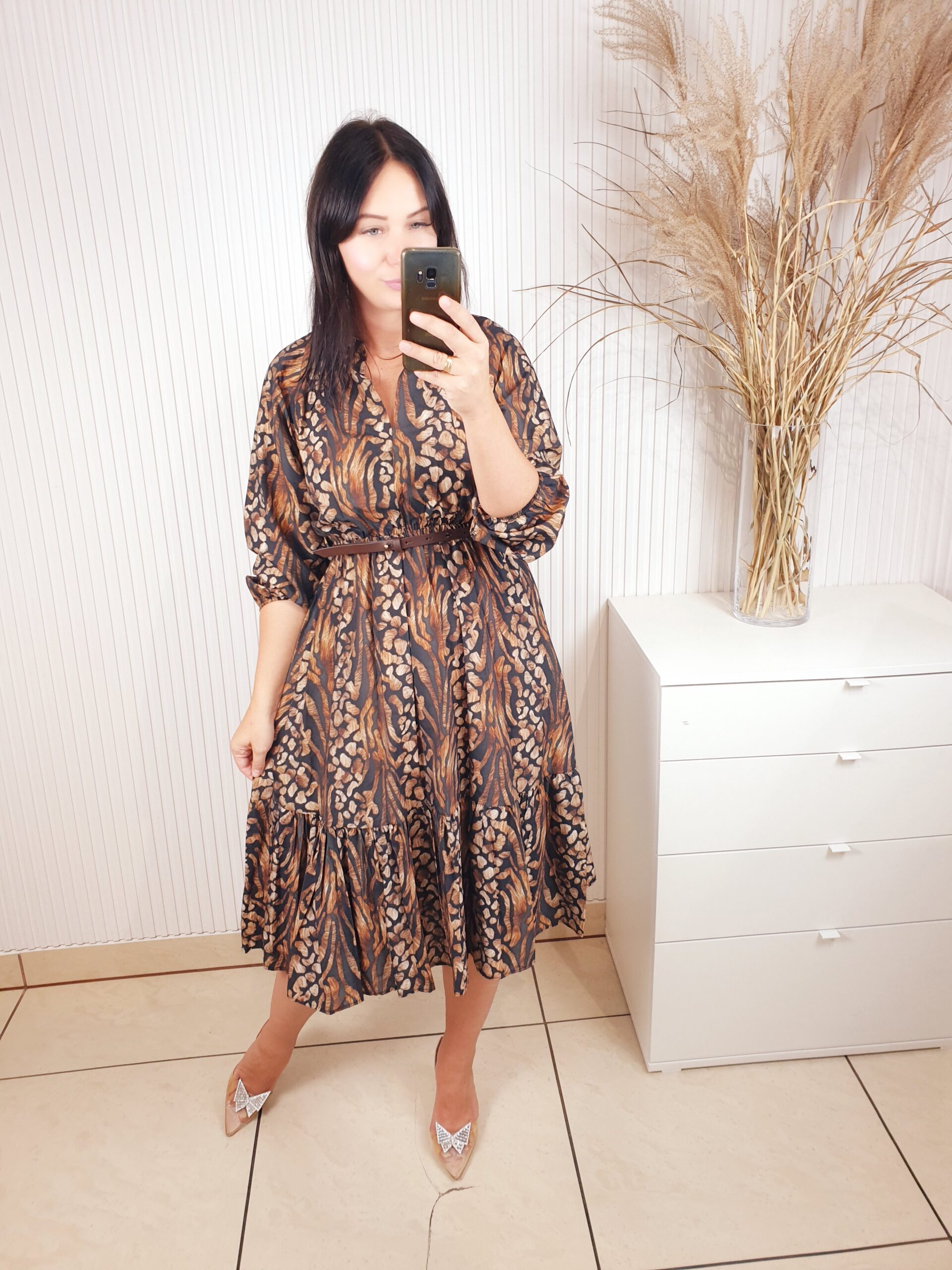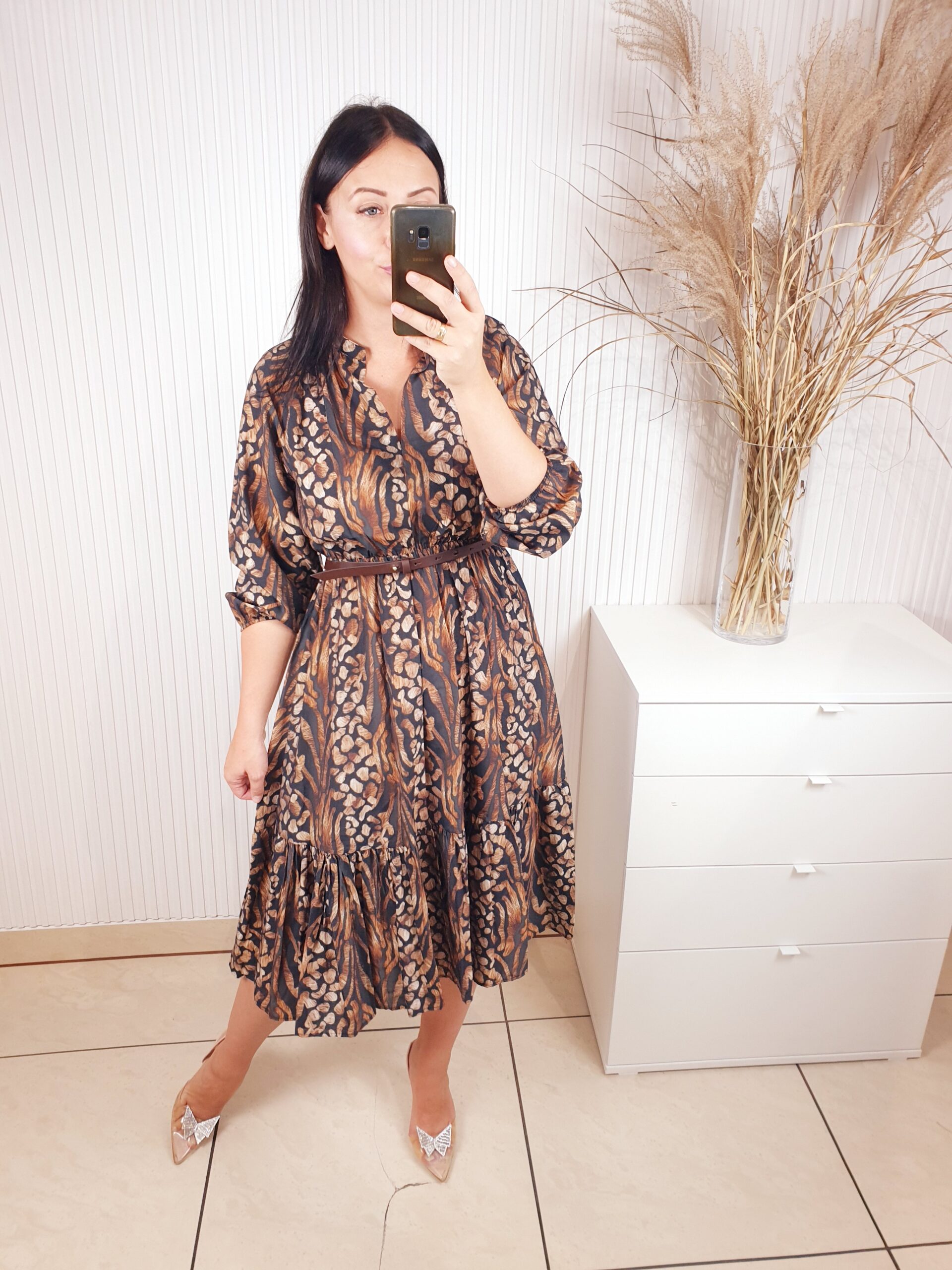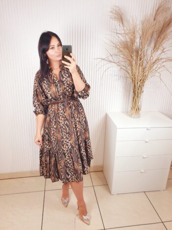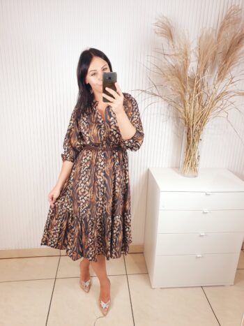 Sukienka z długim rękawem, dekoltem ze stójką, w cudownych, jesiennych barwach. Idealnie sprawdzi się w stylizacji z ramoneską i botkami. Długość midi, posiada gumkę w pasie oraz pasek wykonany ze skóry ekologicznej.