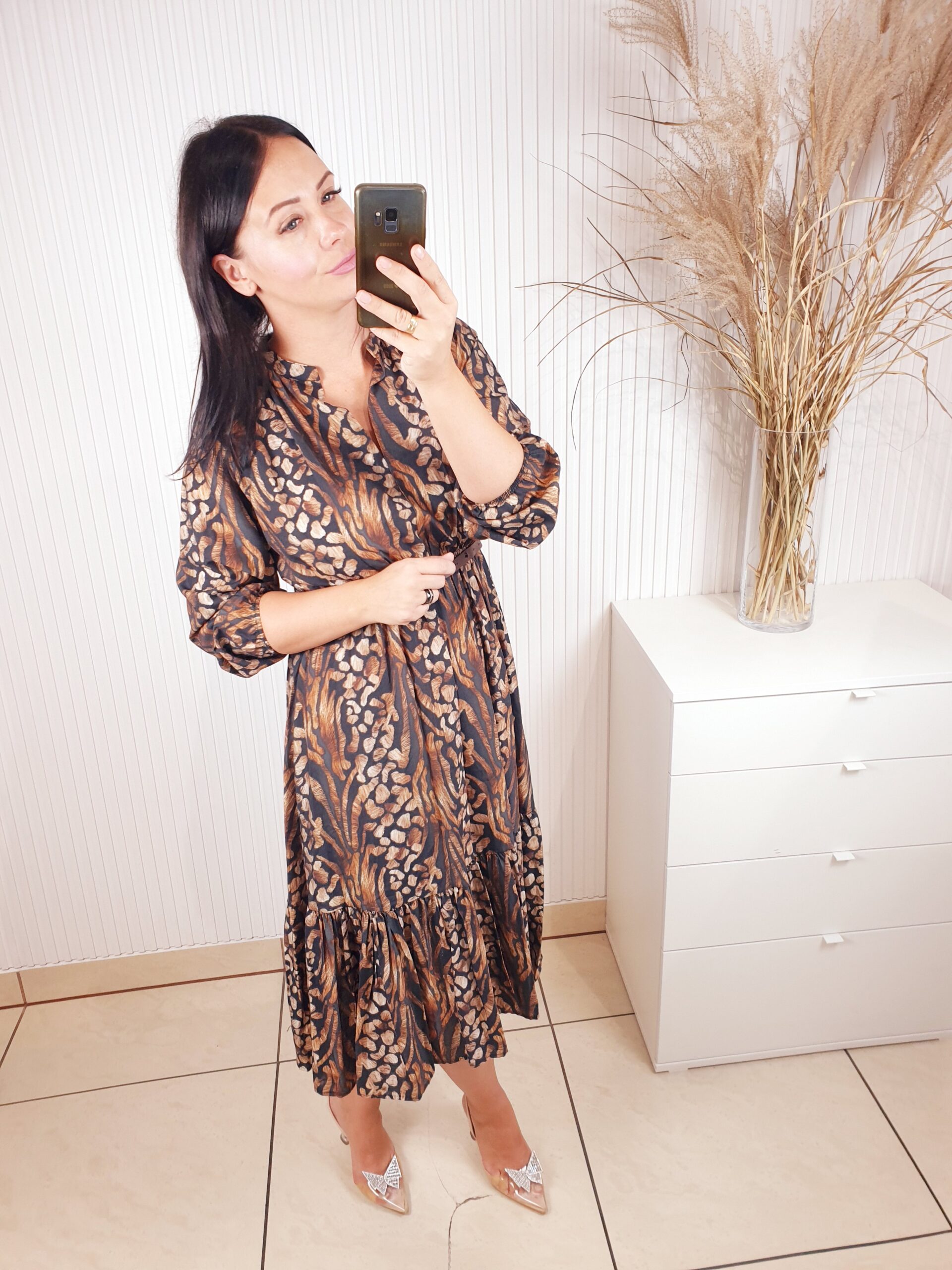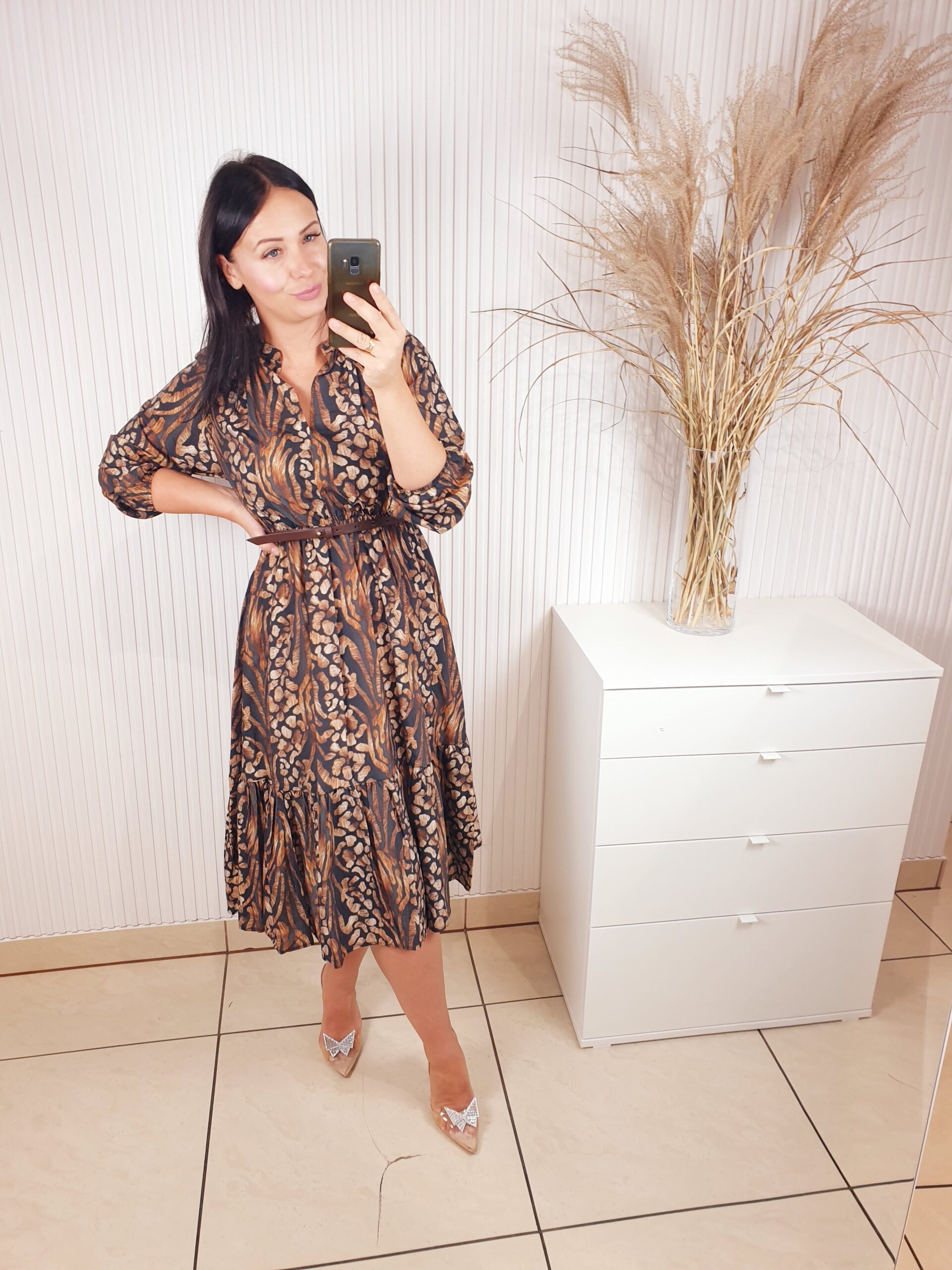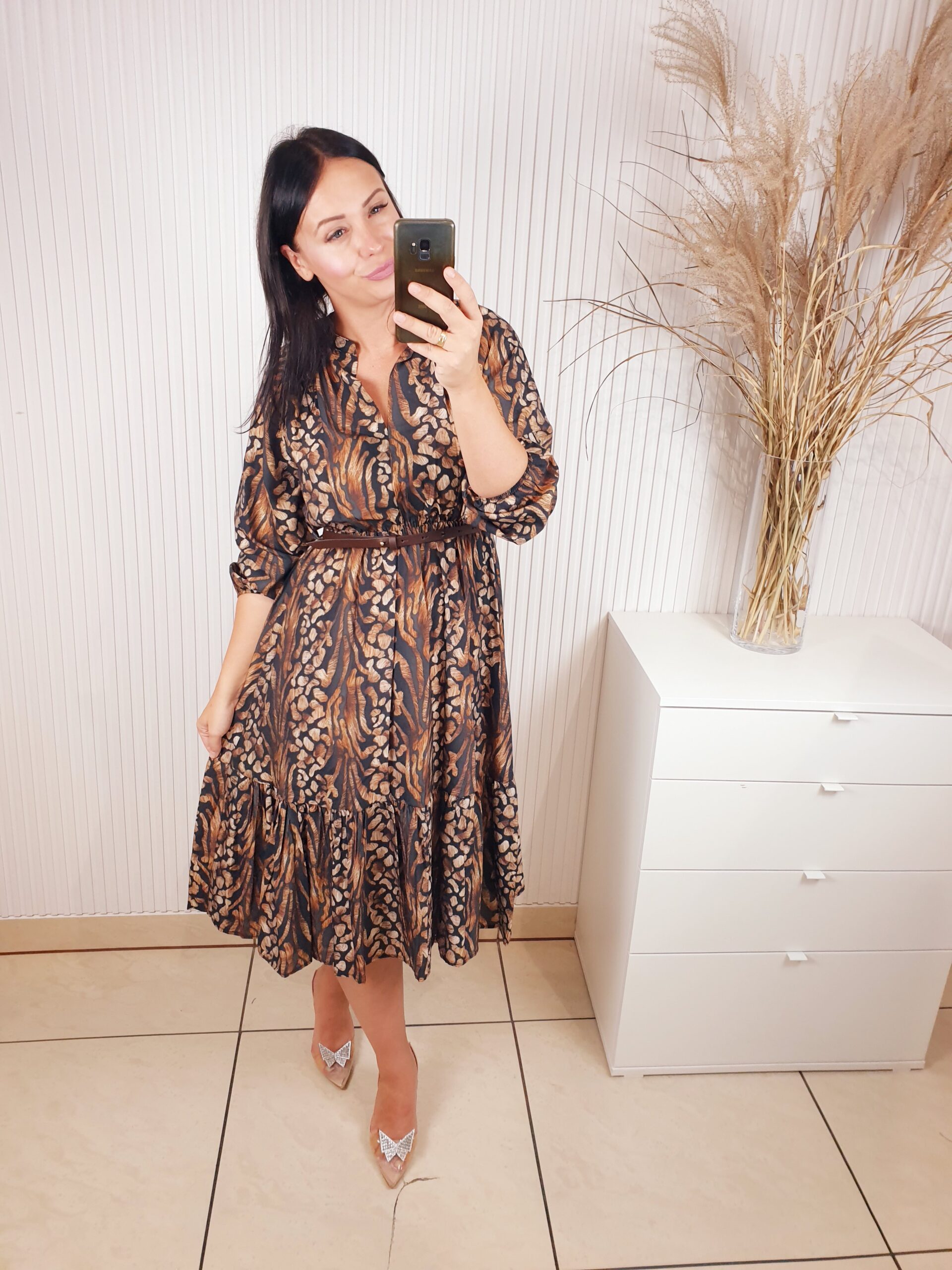 Sukienka z długim rękawem, dekoltem ze stójką, w cudownych, jesiennych barwach. Idealnie sprawdzi się w stylizacji z ramoneską i botkami. Długość midi, posiada gumkę w pasie oraz pasek wykonany ze skóry ekologicznej.