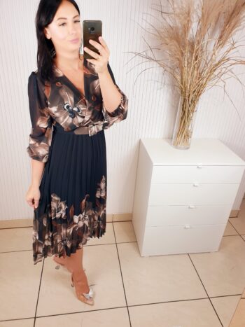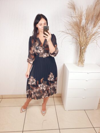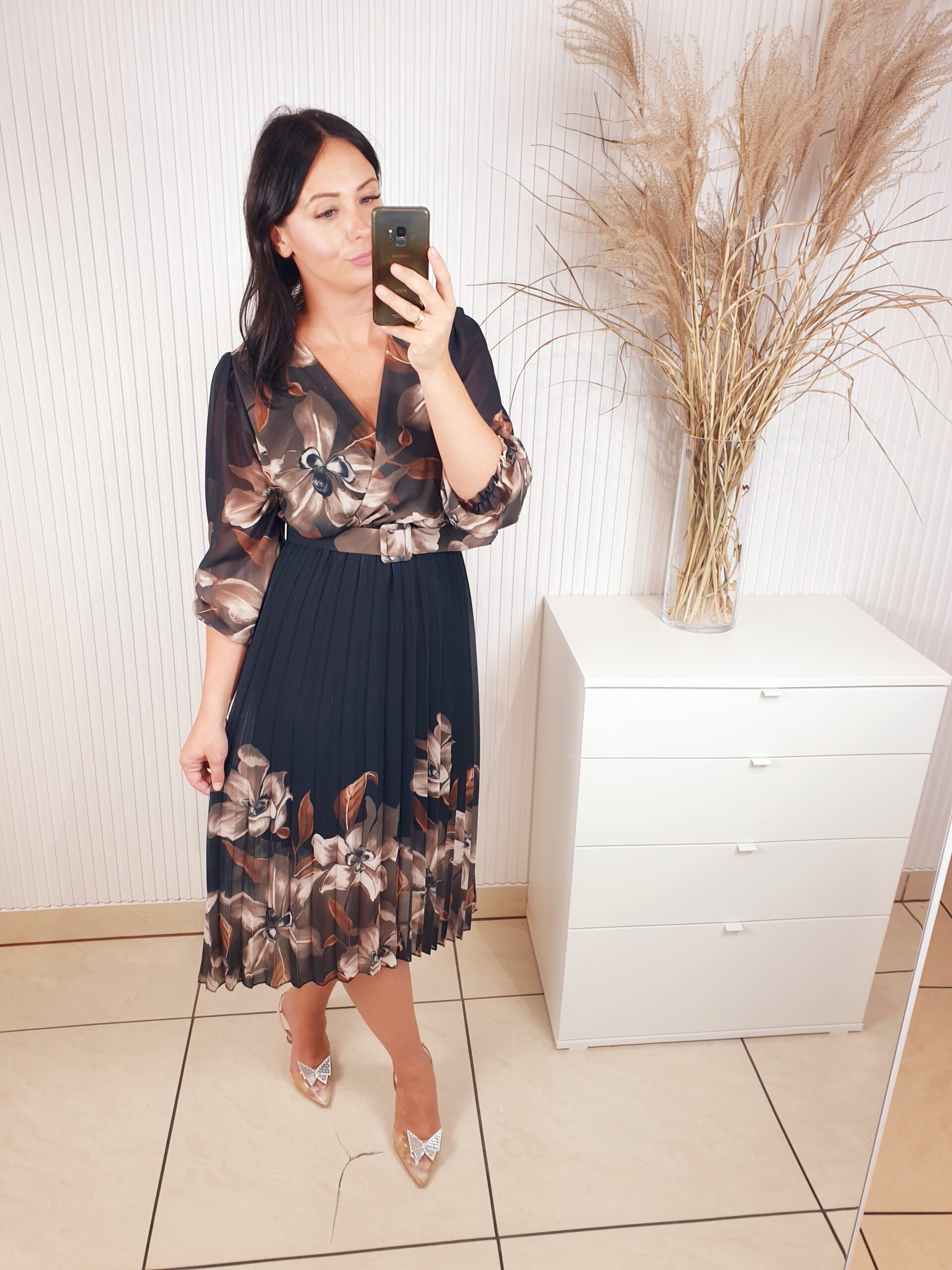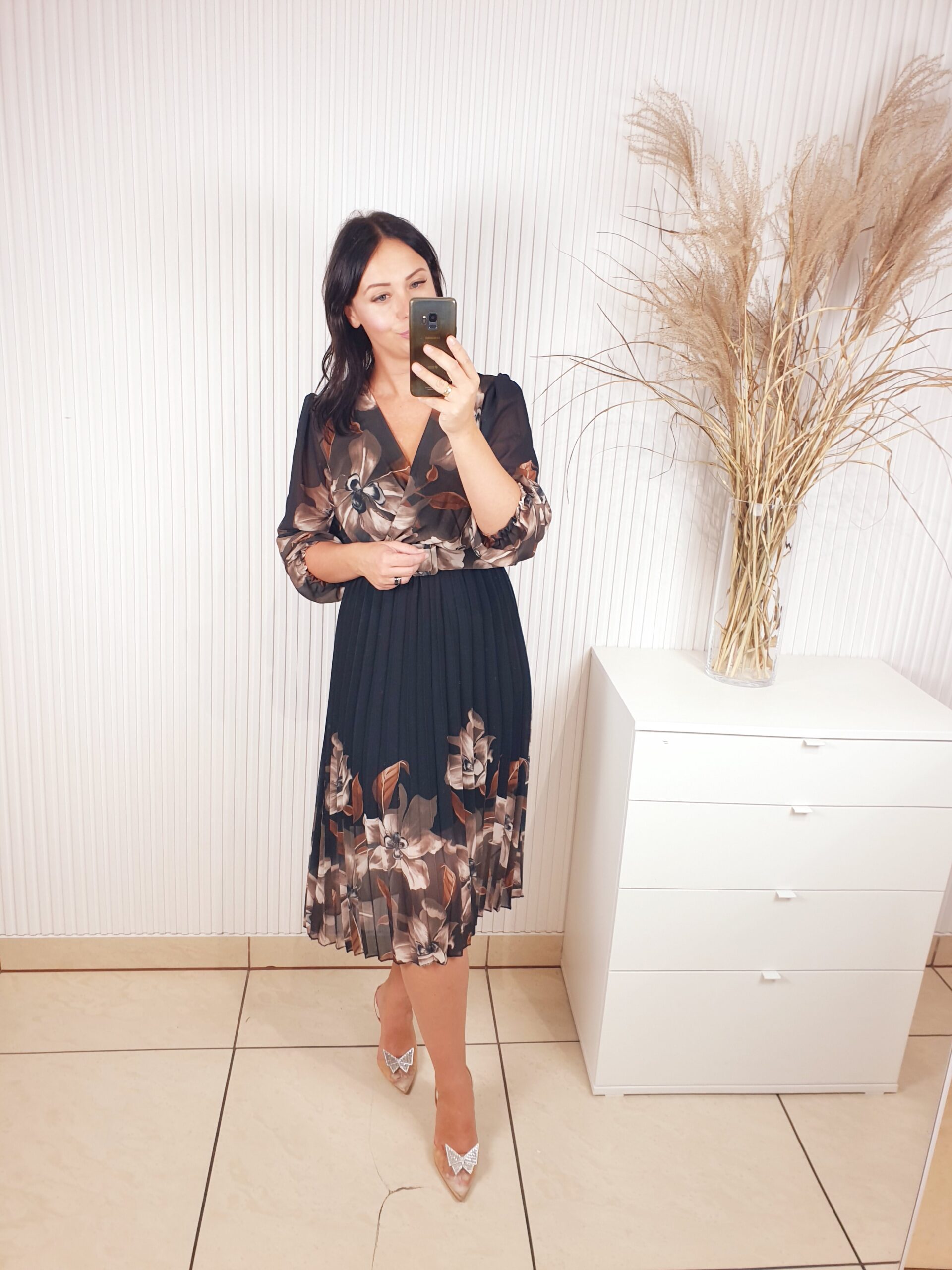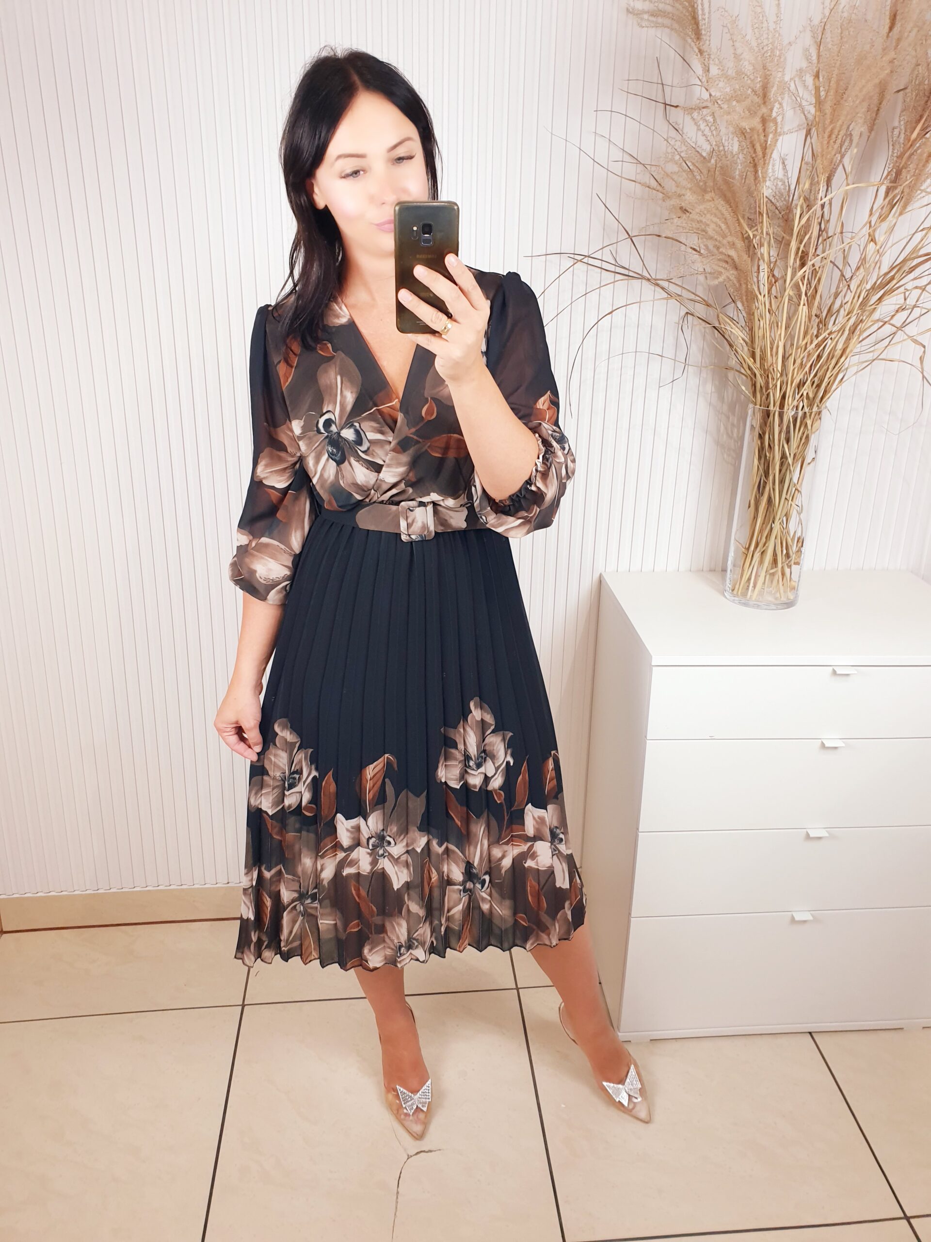 Sukienka z długim rękawem, kopertowym dekoltem w cudownych, jesiennych barwach. Idealnie sprawdzi się w stylizacji z ramoneską i botkami. Długość midi, posiada gumkę w pasie oraz pasek wykonany z tego samego materiału co sukienka.