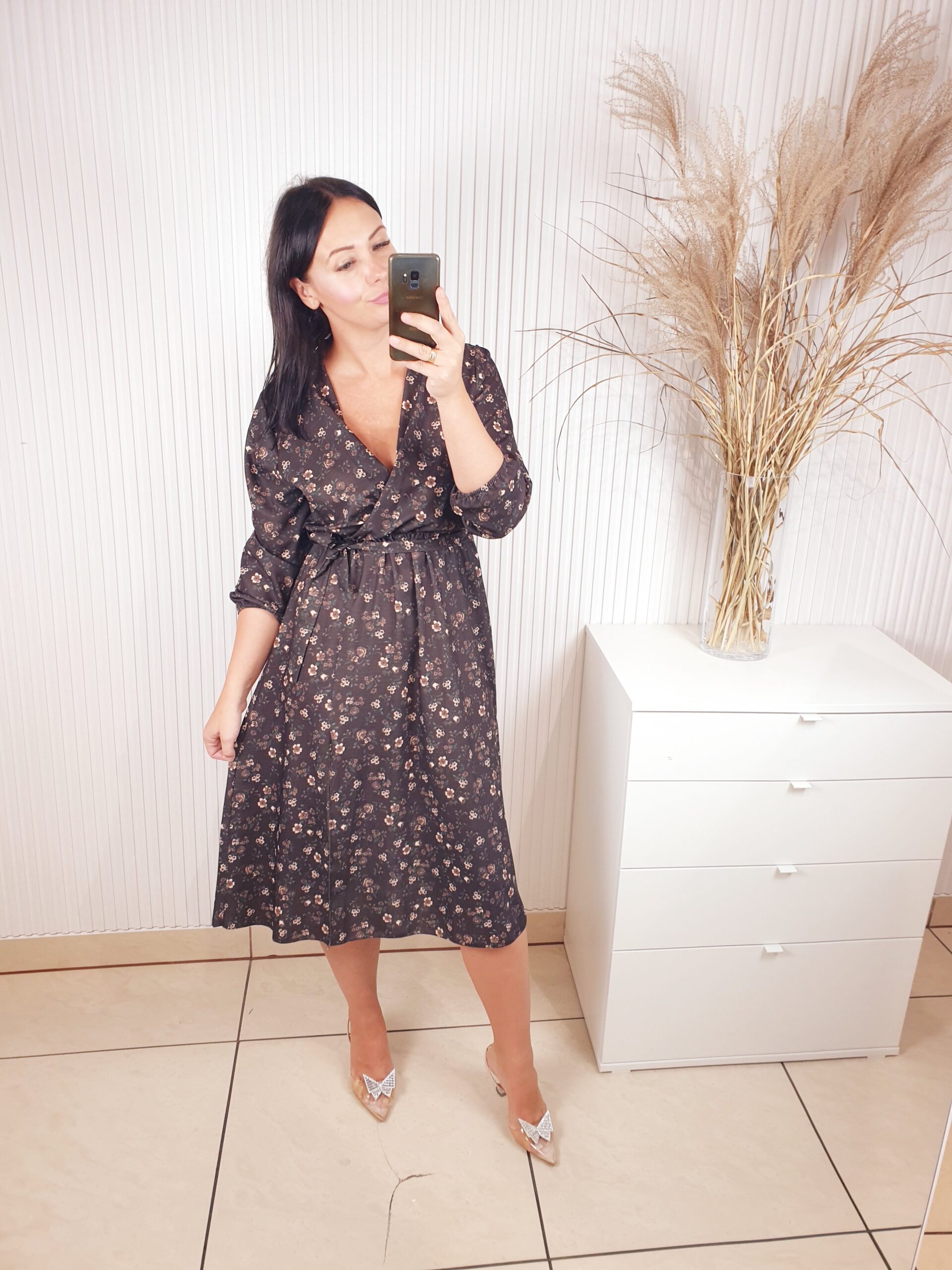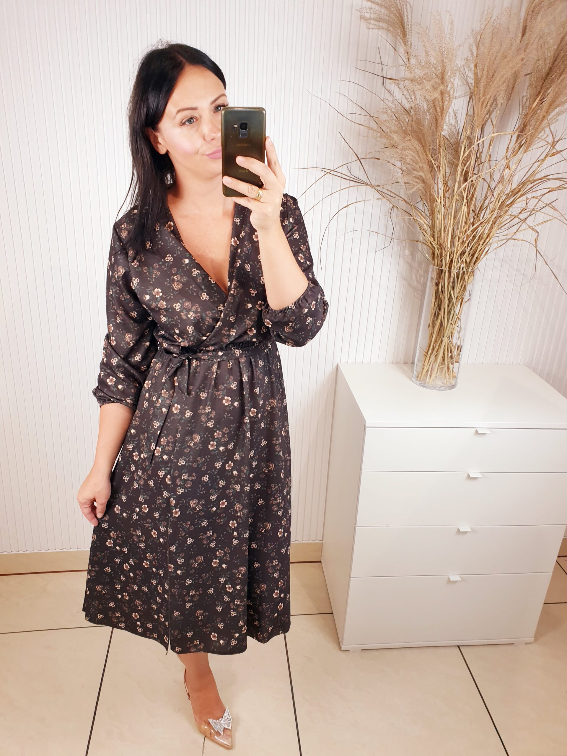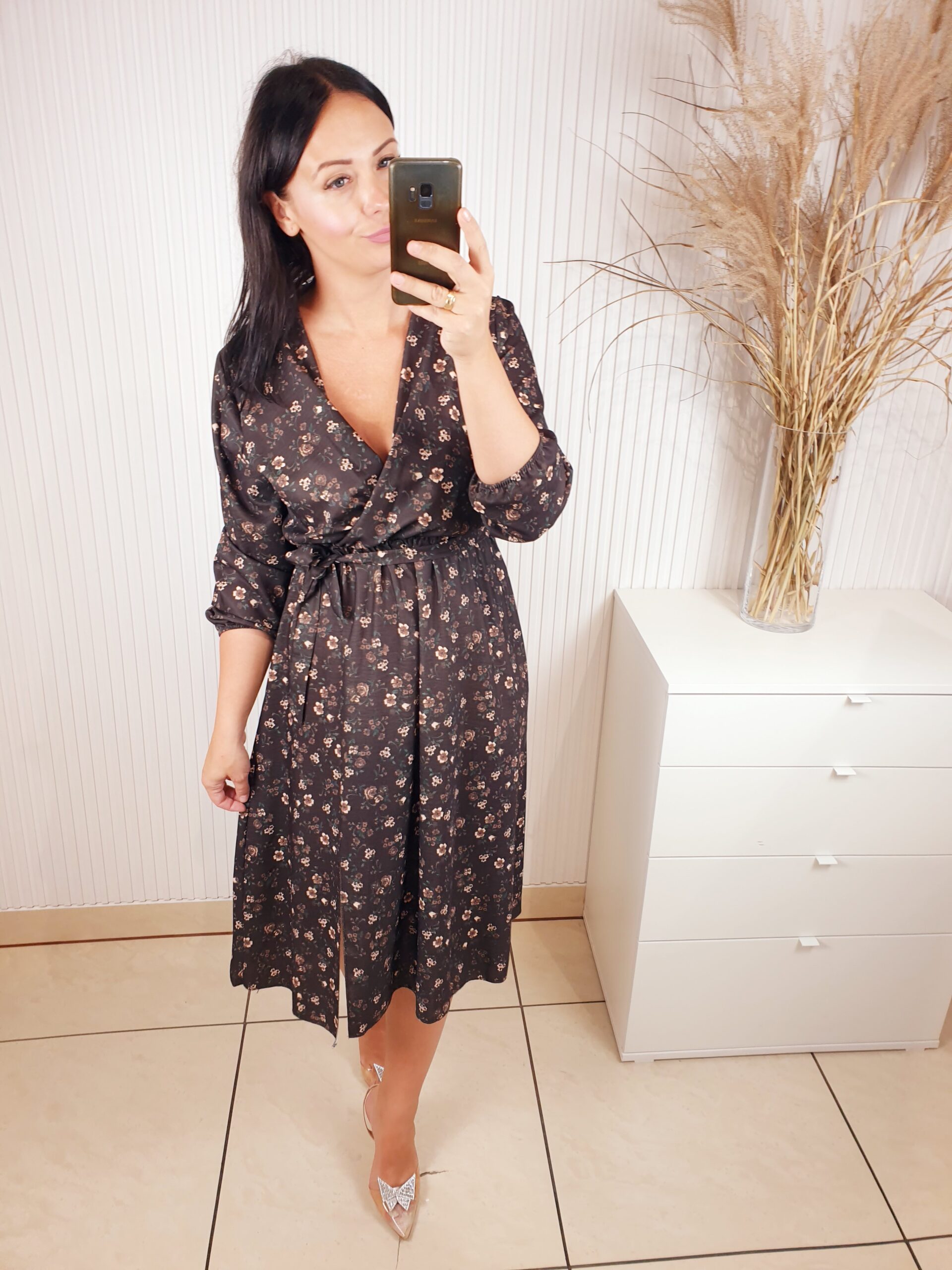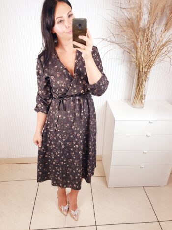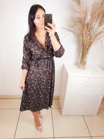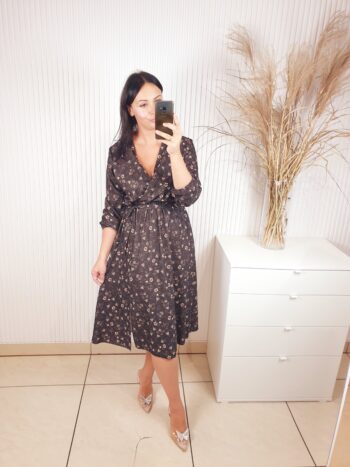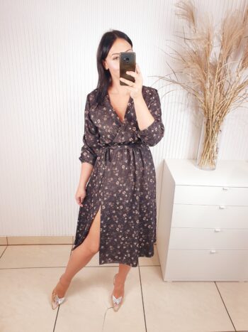 Sukienka z długim rękawem, kopertowym dekoltem w cudownych, jesiennych barwach. Idealnie sprawdzi się w stylizacji z ramoneską i botkami. Długość midi, posiada gumkę w pasie oraz pasek wykonany z tego samego materiału co sukienka oraz rozcięcie po boku.