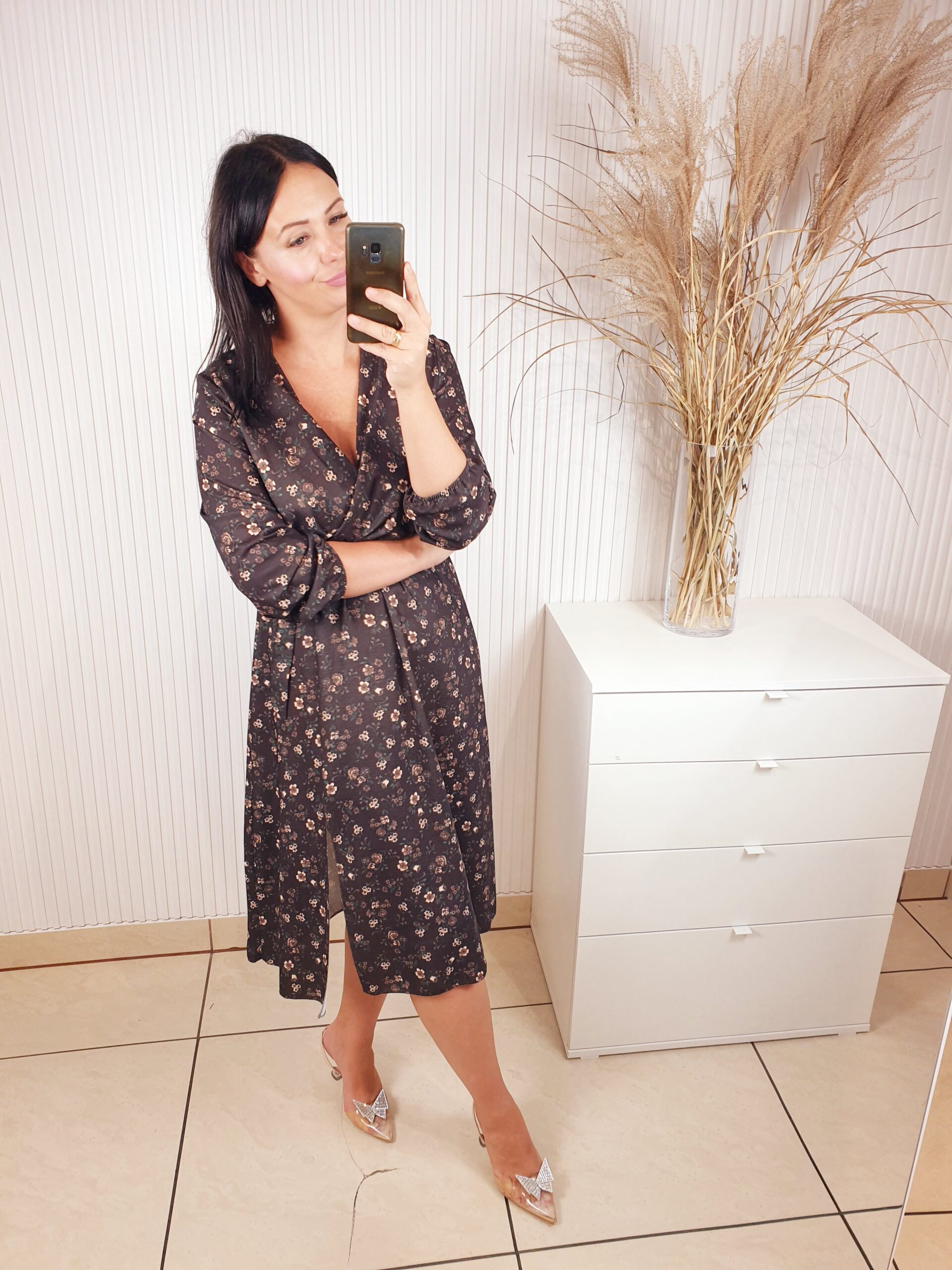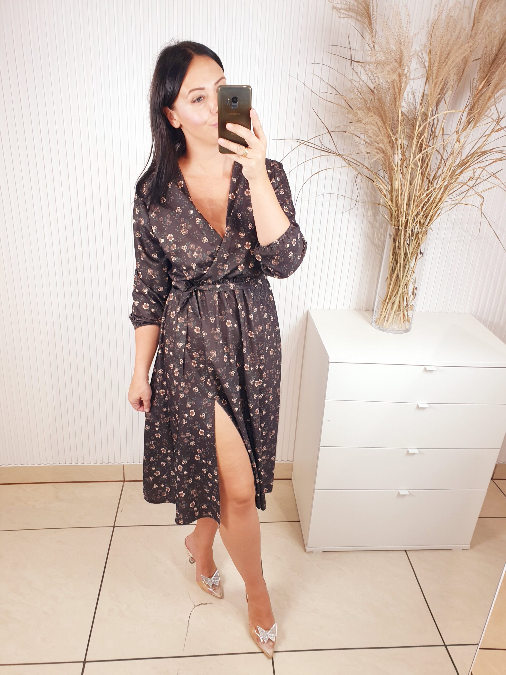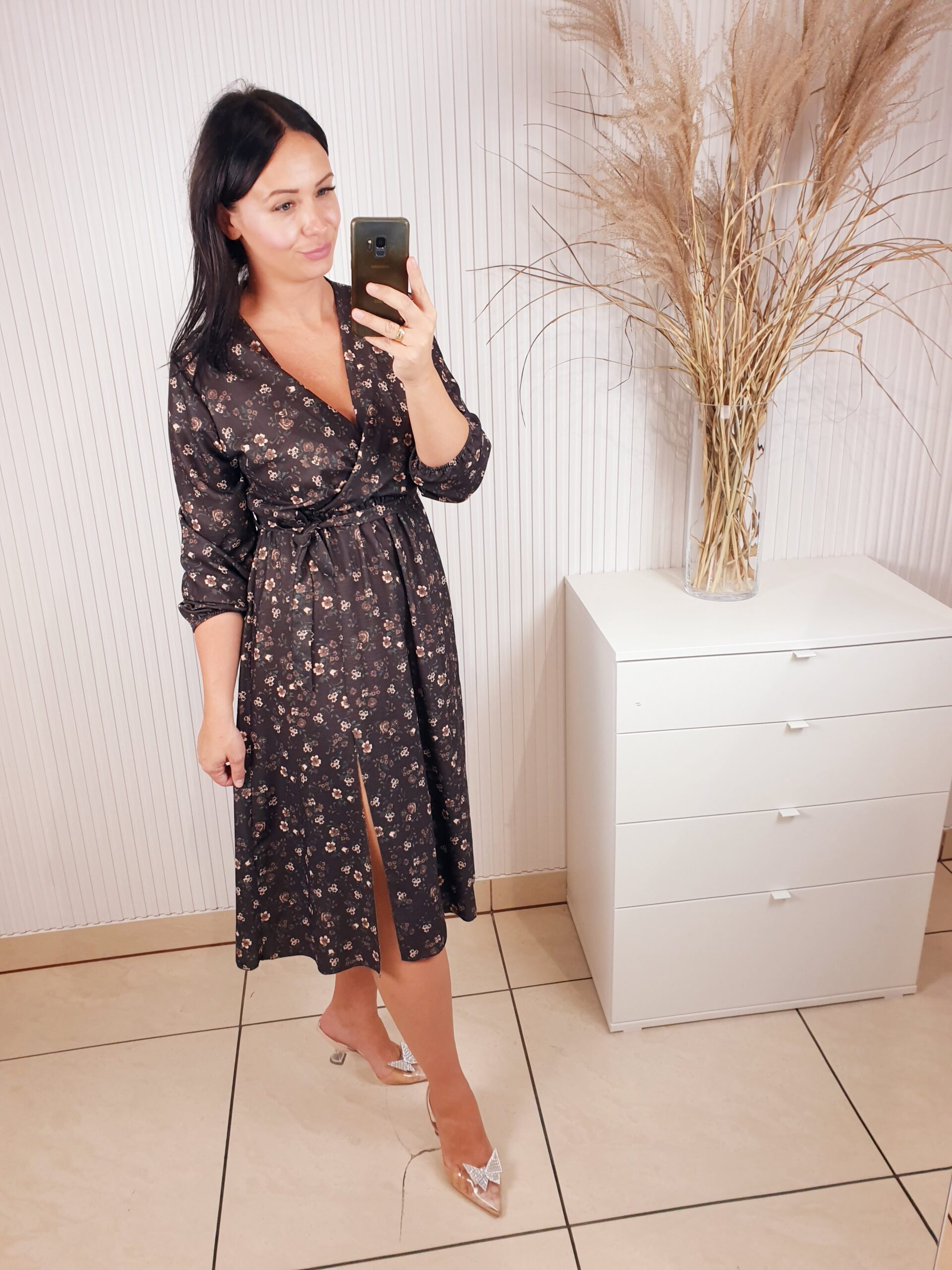 Sukienka z długim rękawem, kopertowym dekoltem w cudownych, jesiennych barwach. Idealnie sprawdzi się w stylizacji z ramoneską i botkami. Długość midi, posiada gumkę w pasie oraz pasek wykonany z tego samego materiału co sukienka oraz rozcięcie po boku.
