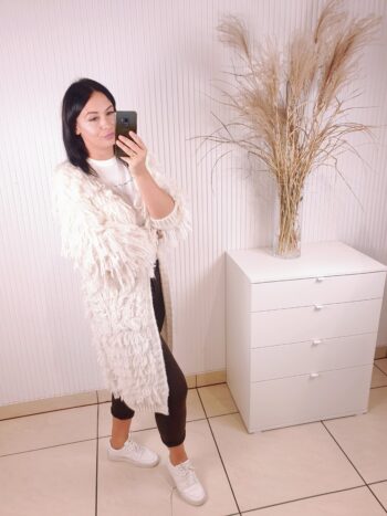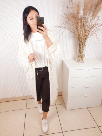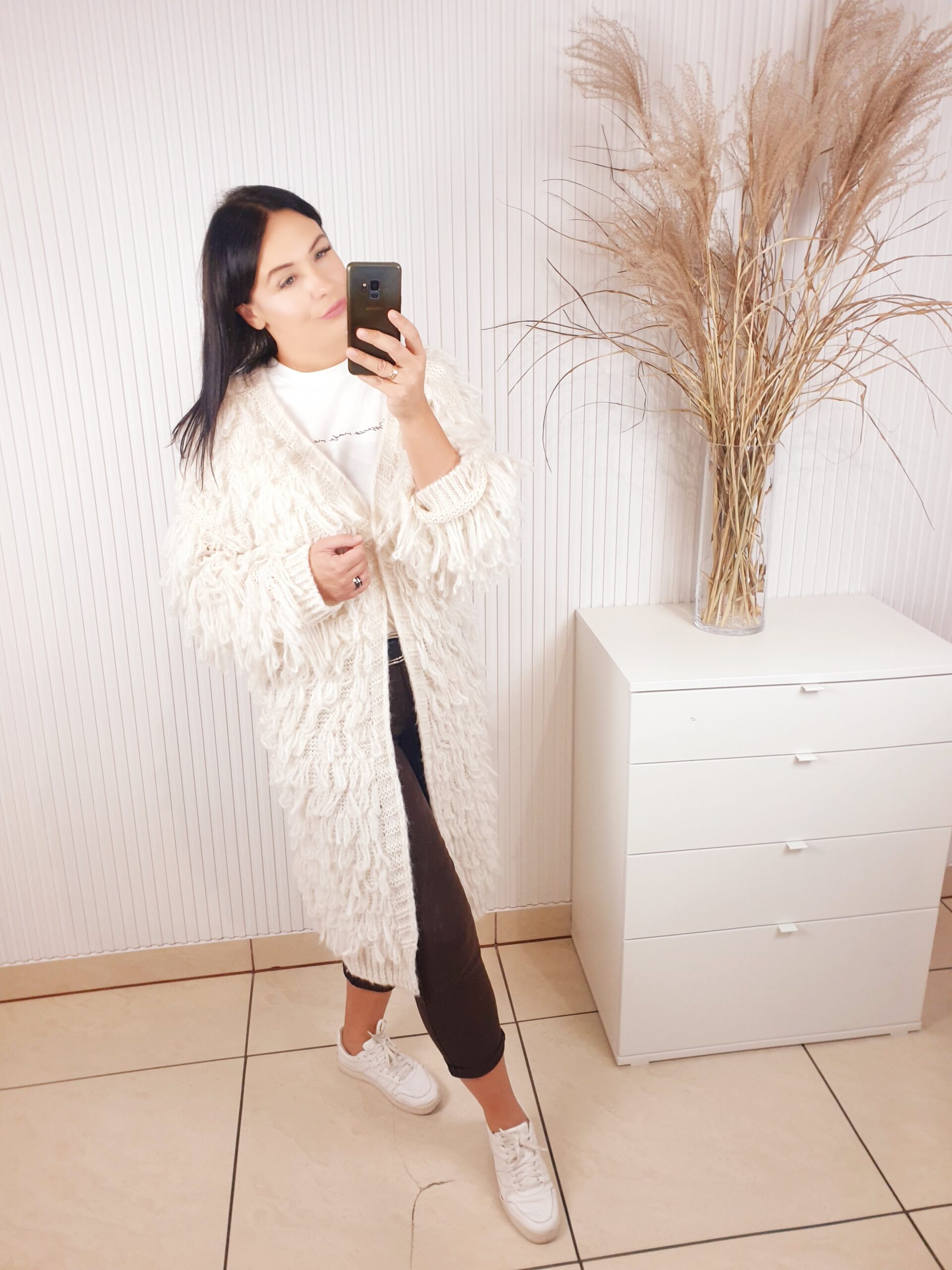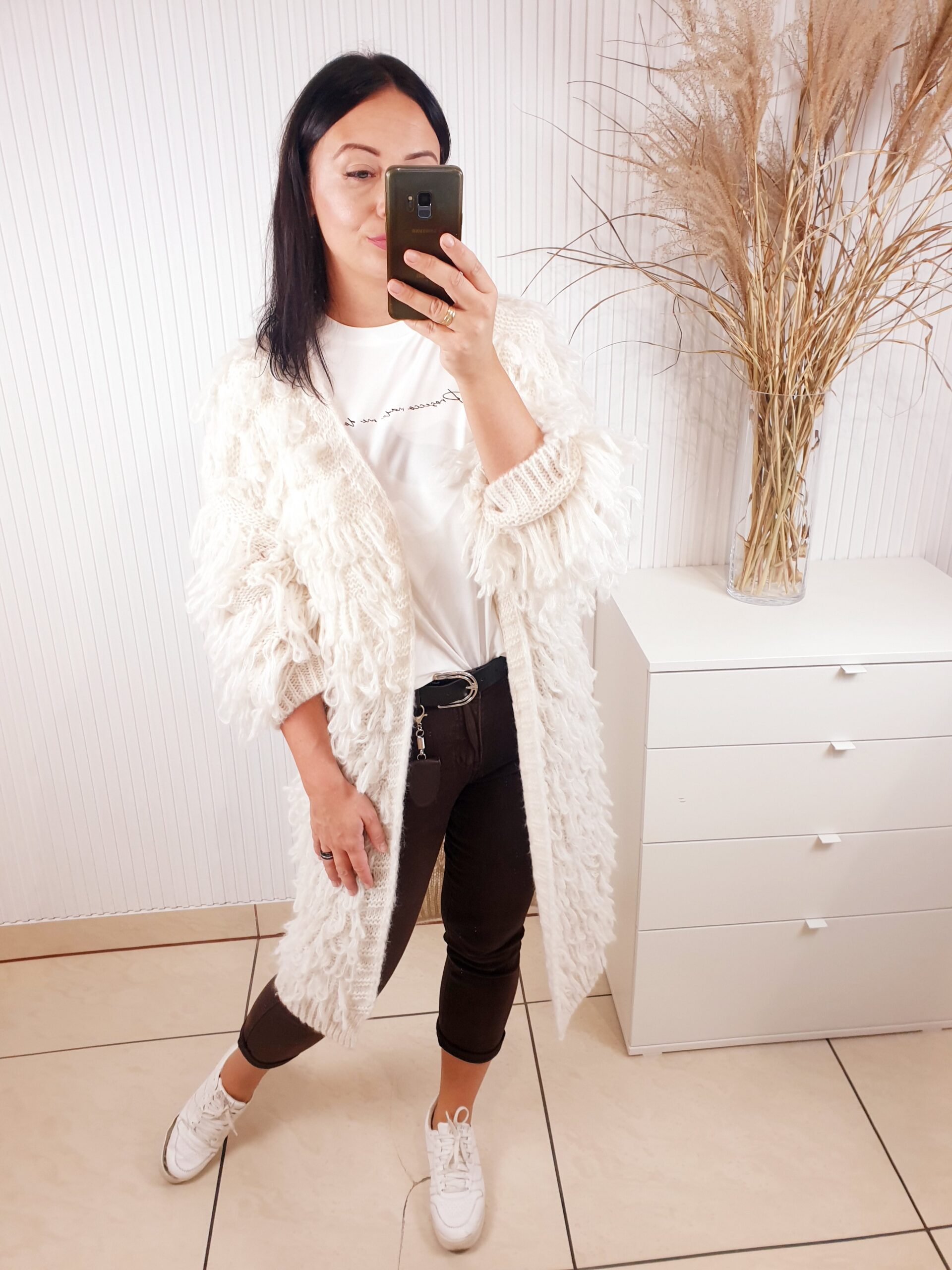 Długi kardigan wykonany z miękkiego materiału z domieszką wełny i wiskozy. Wyróżnia się ozdobnymi frędzlami. Model nie posiada zapięcia. Idealny do jesiennych stylizacji- oryginalny, na pewno przykuje uwagę innych osób.
