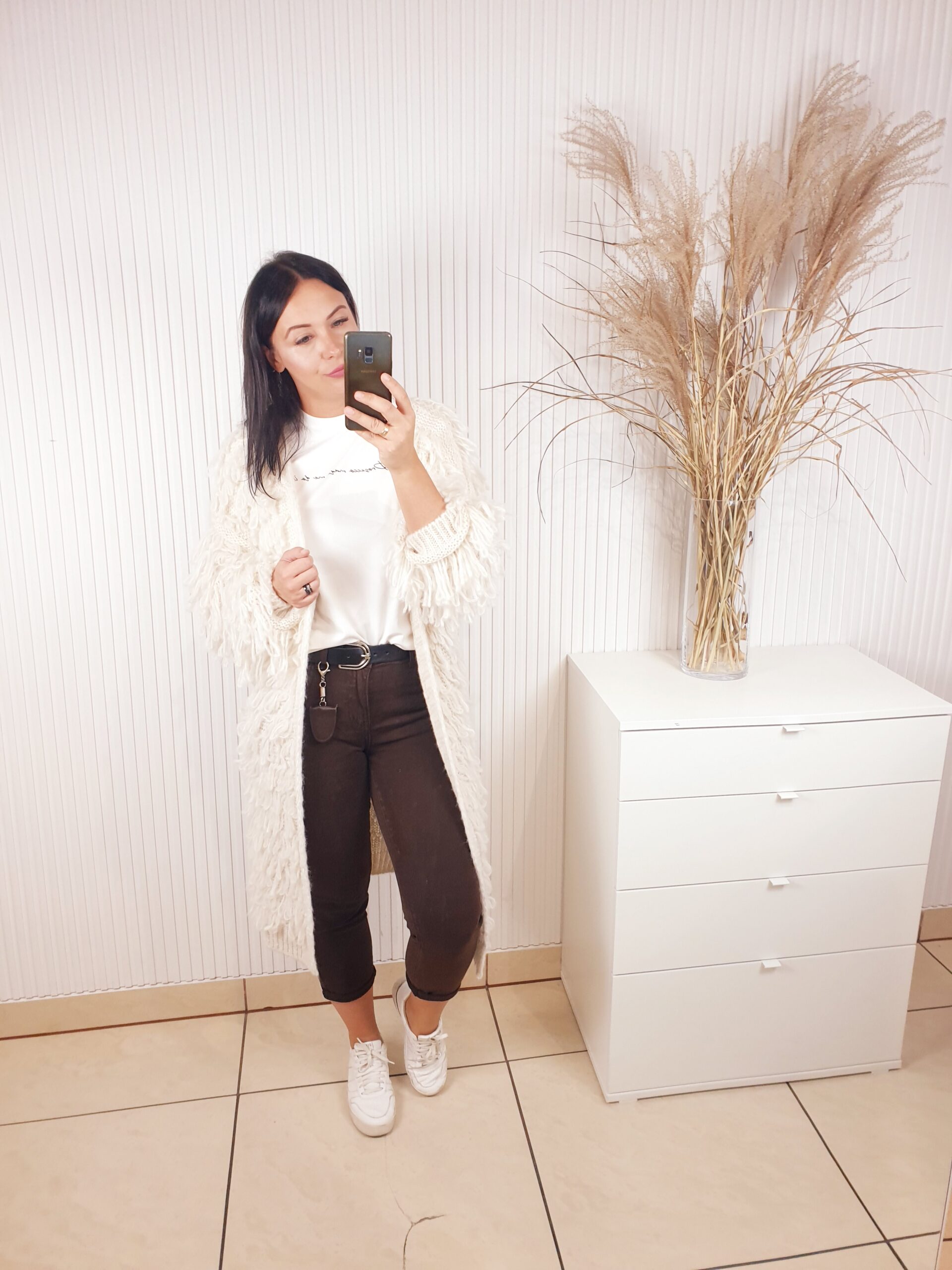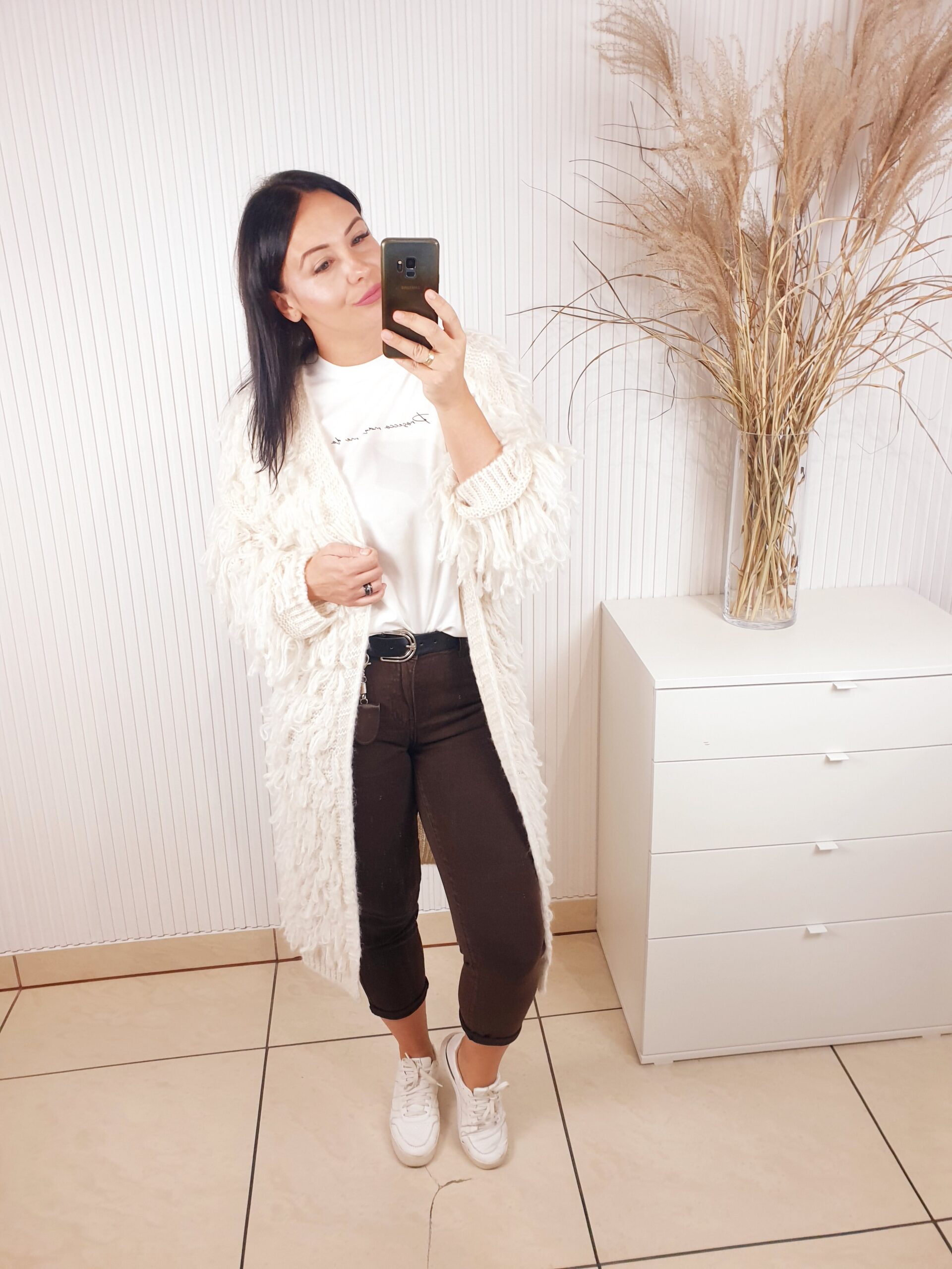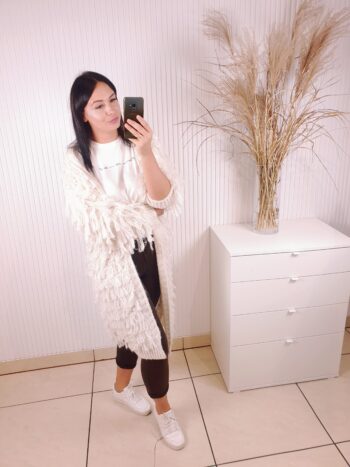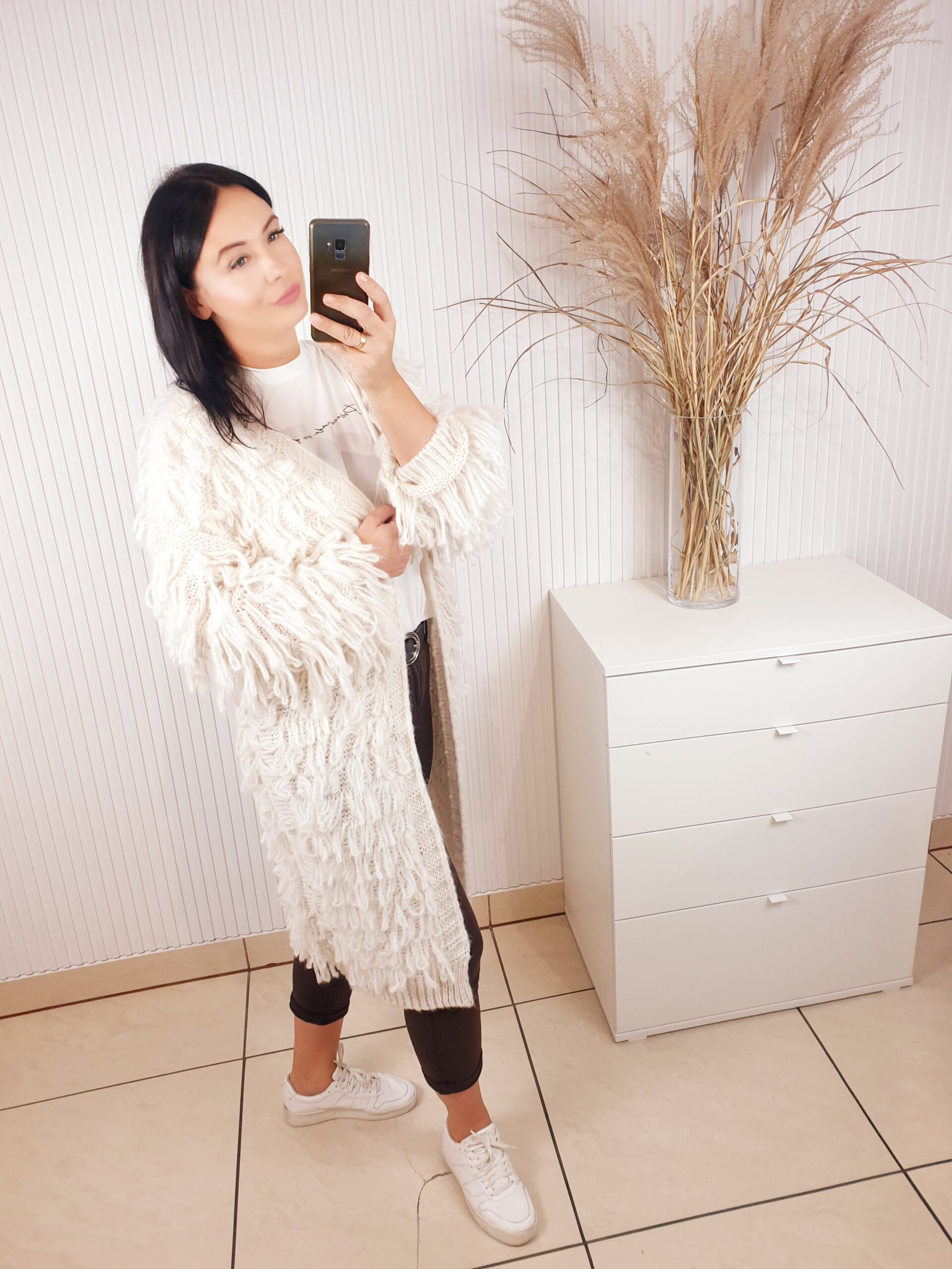 Długi kardigan wykonany z miękkiego materiału z domieszką wełny i wiskozy. Wyróżnia się ozdobnymi frędzlami. Model nie posiada zapięcia. Idealny do jesiennych stylizacji- oryginalny, na pewno przykuje uwagę innych osób.