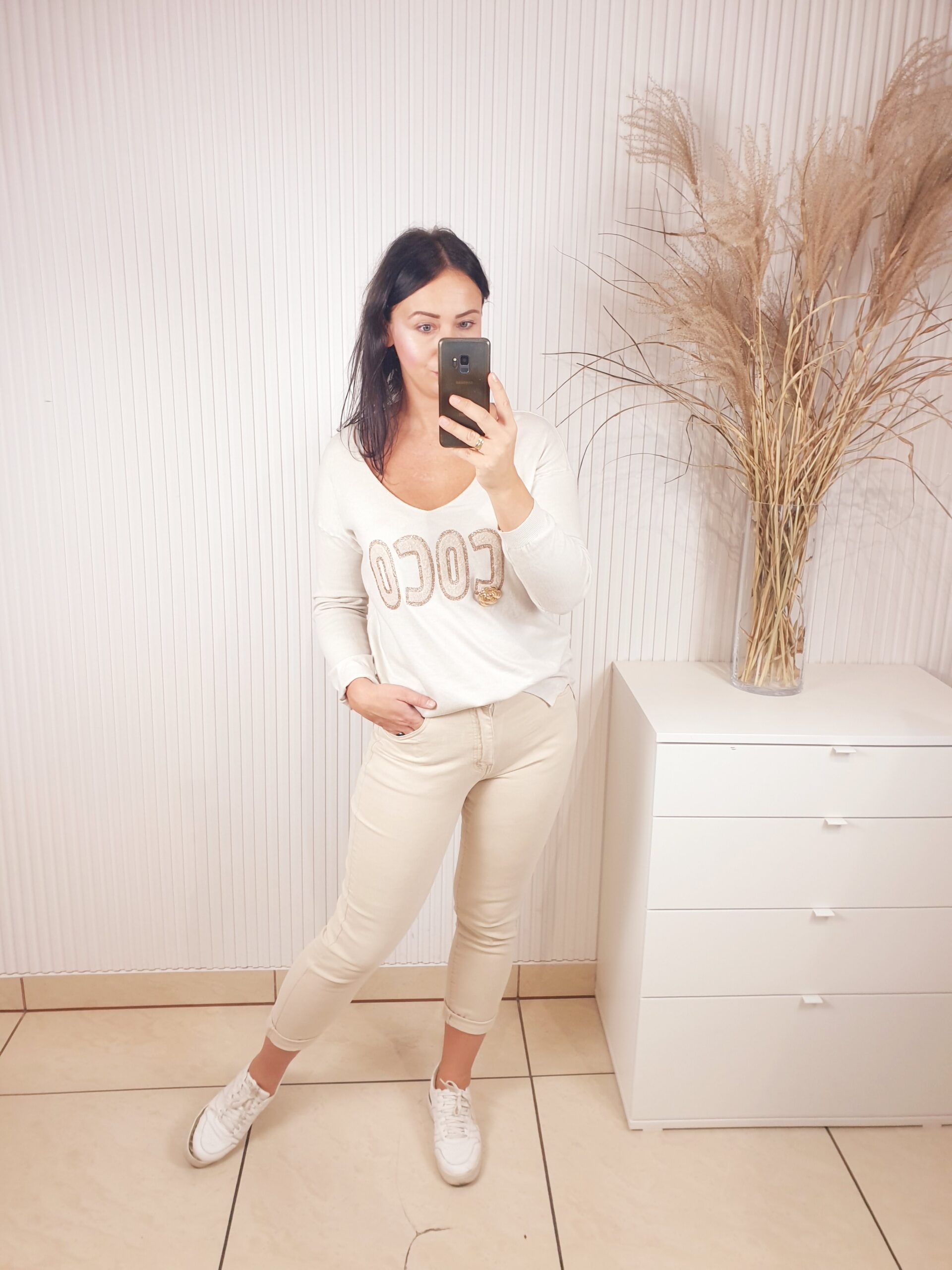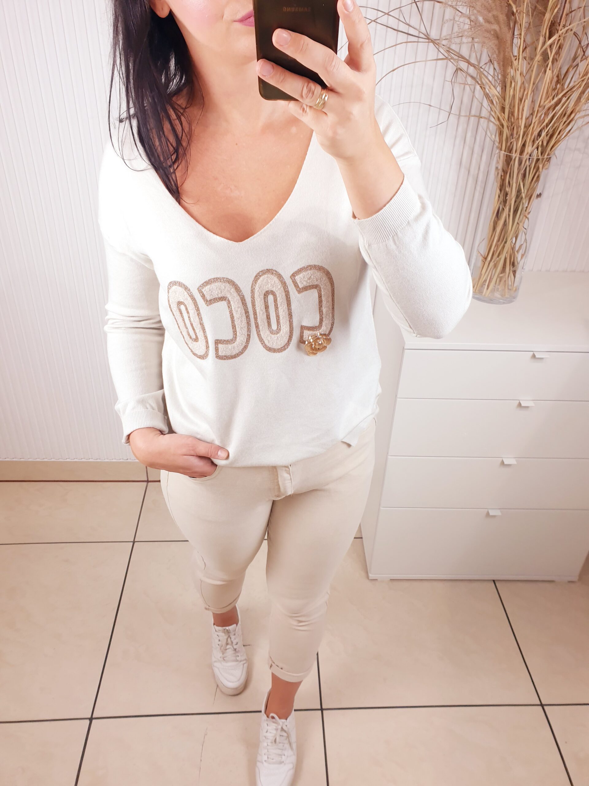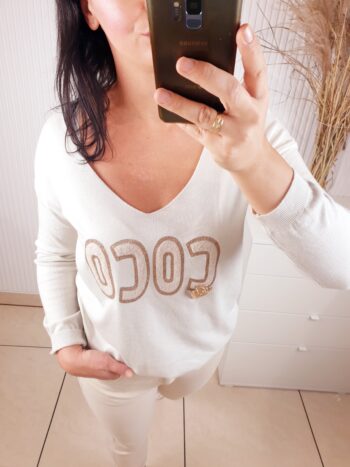 Cudowny, delikatny sweter z dekoltem w serek i długim rękawem. Posiada błyszczącą aplikację z napisem COCO i złotą, odpinaną broszką. Bardzo komfortowy krój, wykonany z wiskozy z dodatkami. Idealny na jesienne, chłodniejsze dni.
