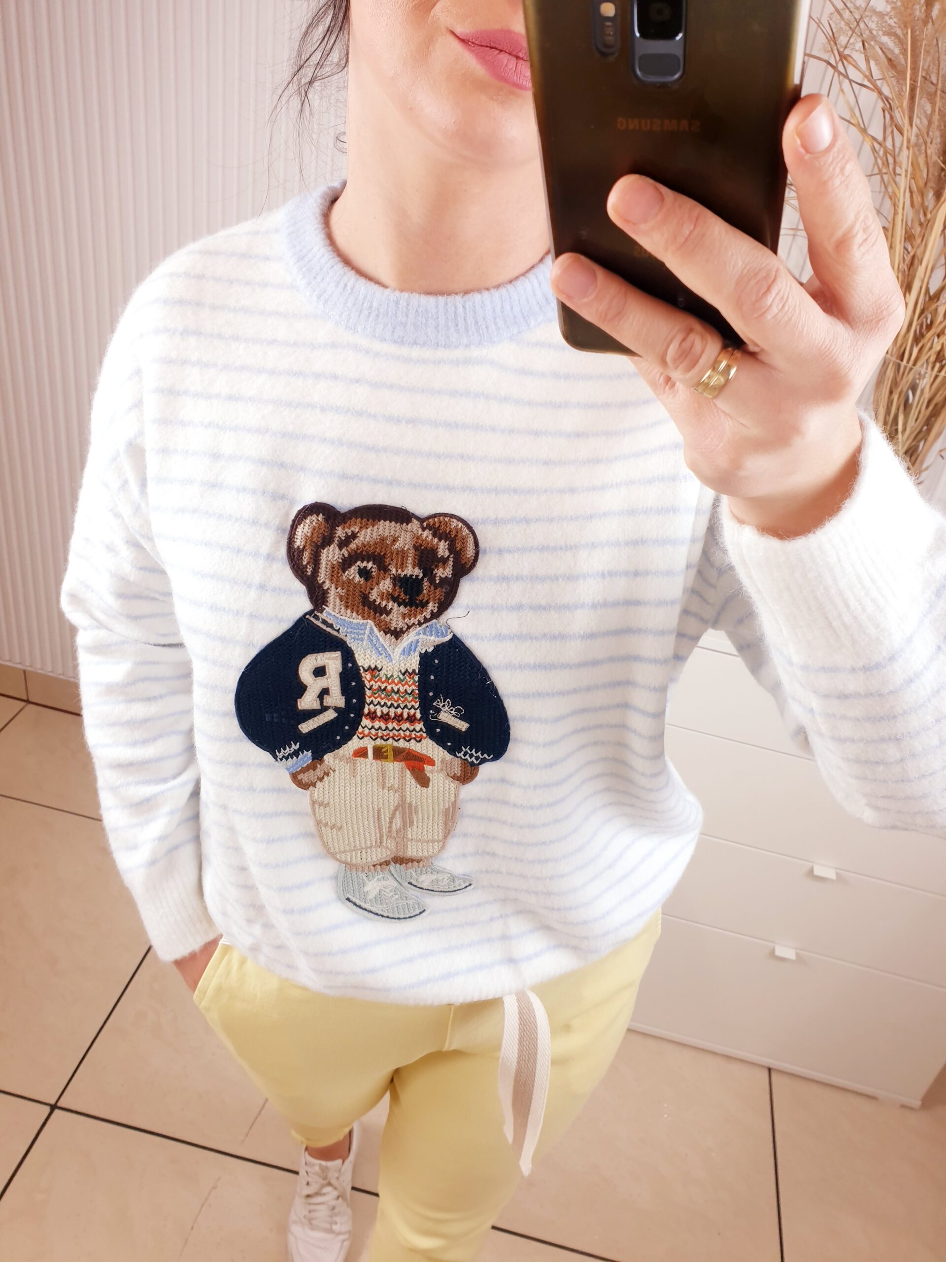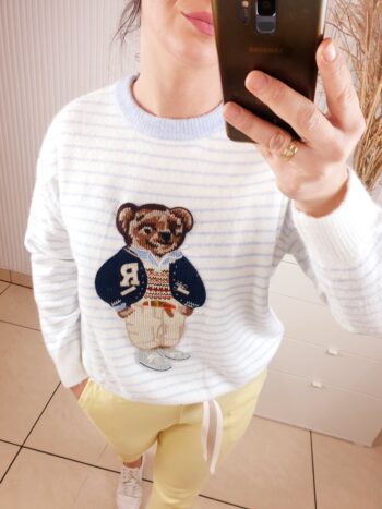 sweter, damski, w paseczki, niebiesko-białe, z aplikacją misia