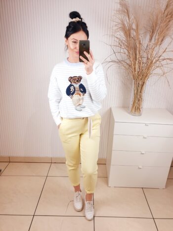 Cudowny sweterek w niebieskie paseczki, z okrągłym dekoltem i długim rękawem. Z przodu posiada aplikację miśka w granatowo-beżowych odcieniach. Idealny do wiosennych stylizacji, miły w dotyku i komfortowy w noszeniu.