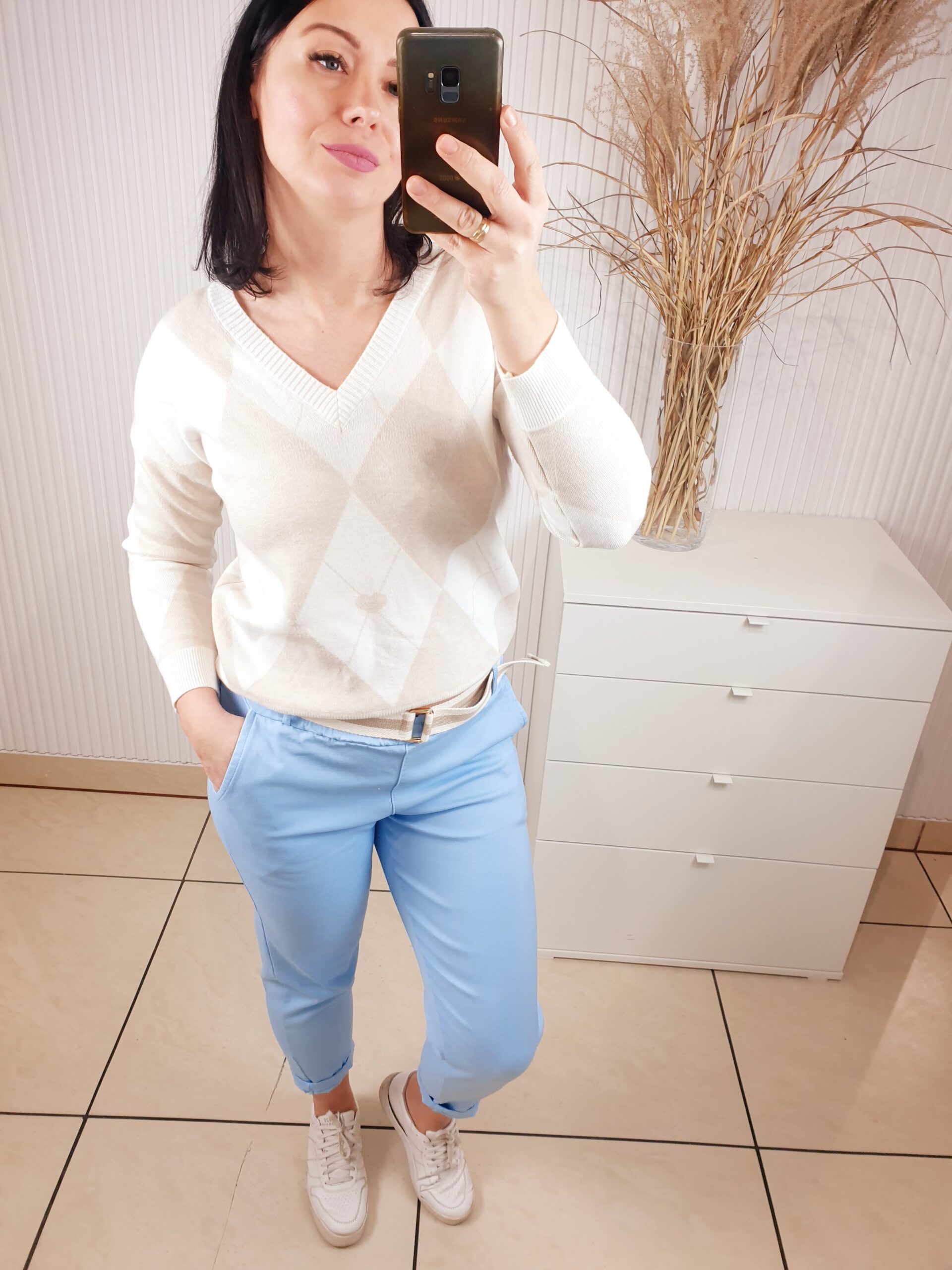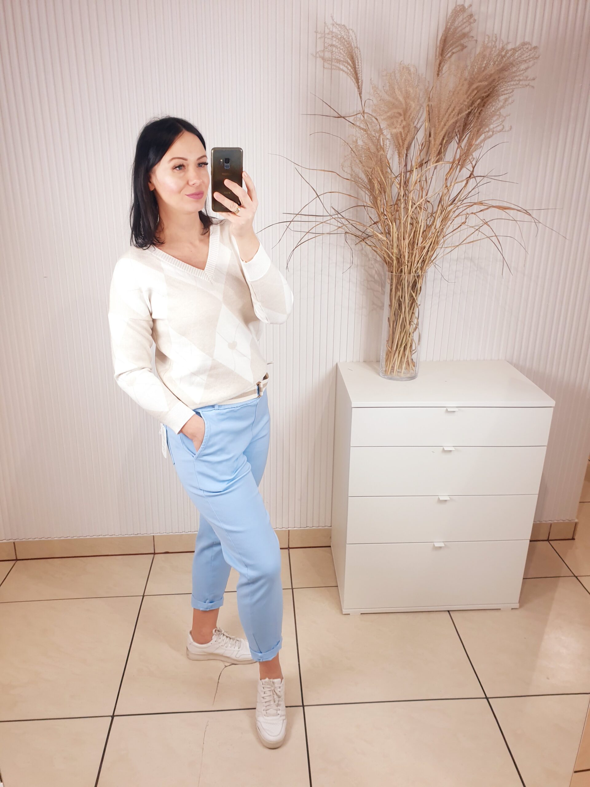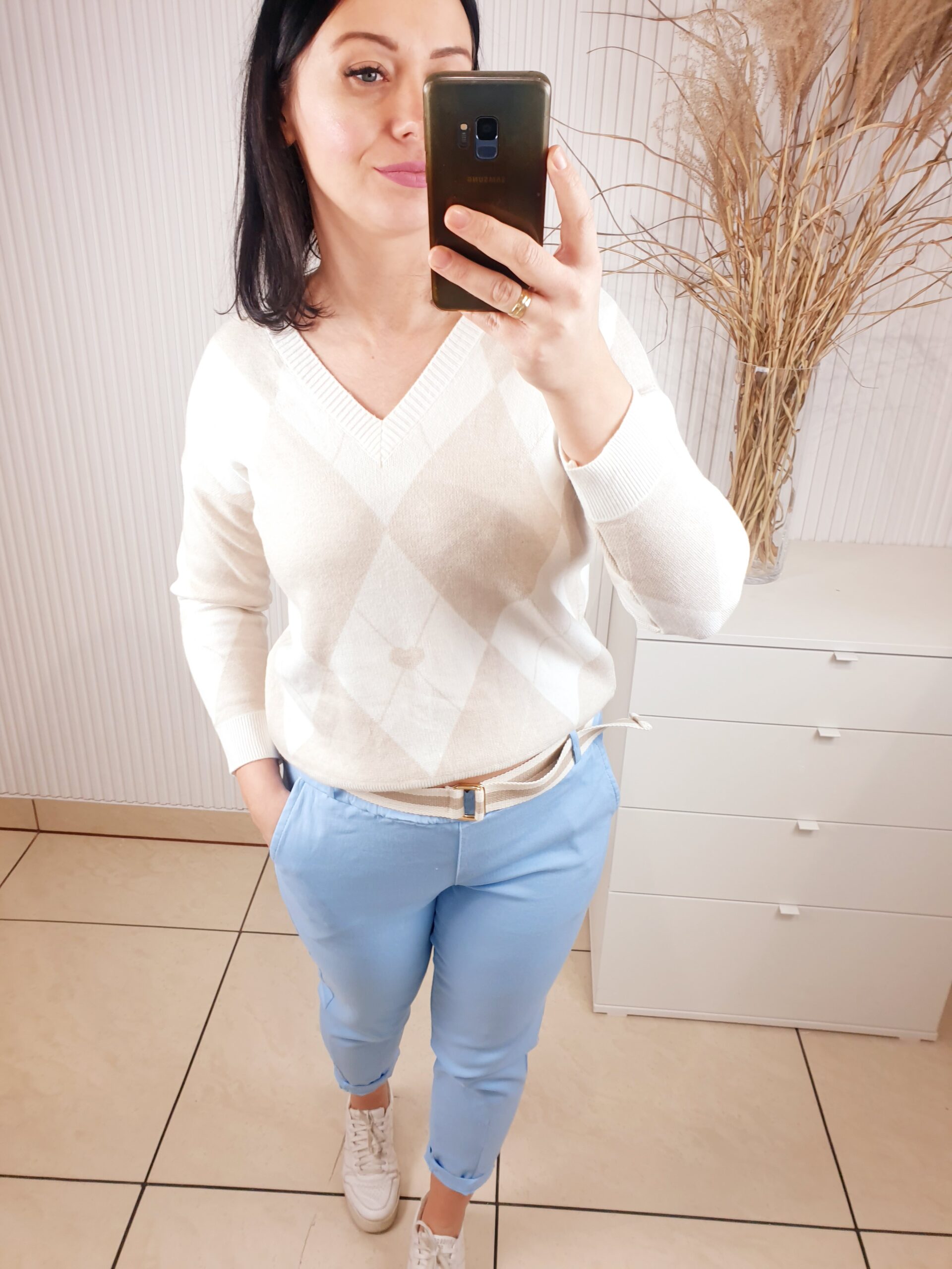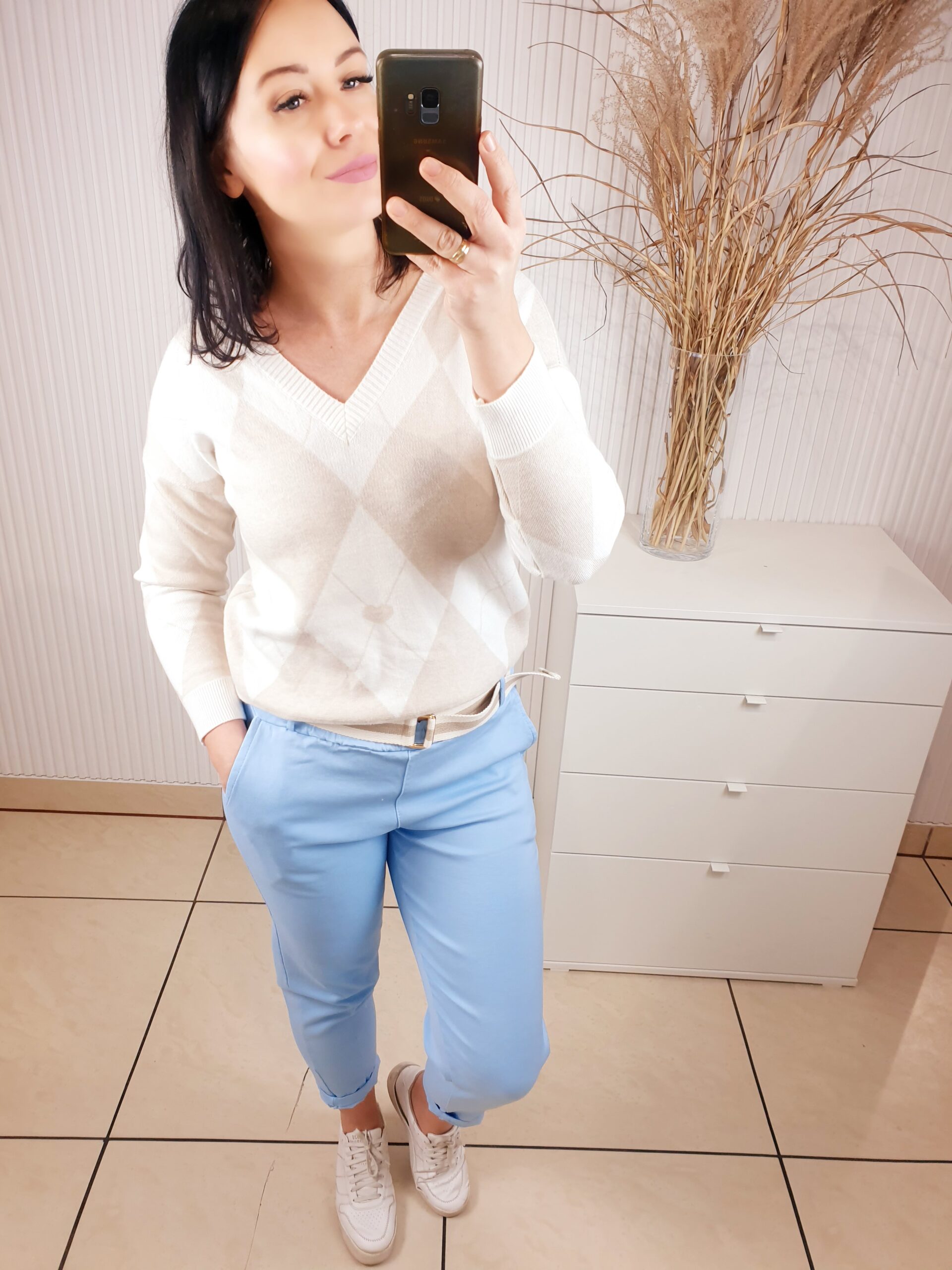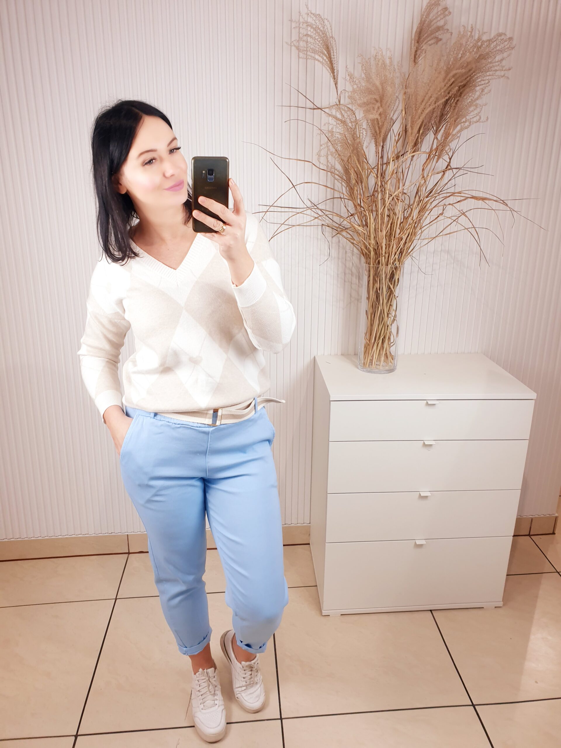 Cudowny sweterek wykonany w 50% z wiskozy. Posiada dekolt w serek oraz ściągacze przy rękawach oraz u dołu. W cudowny delikatny wzór biało-beżowych rombów. Idealnie sprawdzi się do świeżych, wiosennych stylizacji.