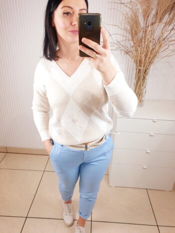 sweter, długi rękaw, damski sweter w romby, dekolt w serek, beżowo-biały