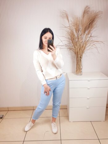 Eleganckie spodnie z wysokim stanem, z długimi rozszerzanymi nogawkami, które posiadają rozcięcia. Z przodu modne przeszycia na całej długości. Idealnie podkreślają sylwetkę, modelują i optycznie wyszczuplają.